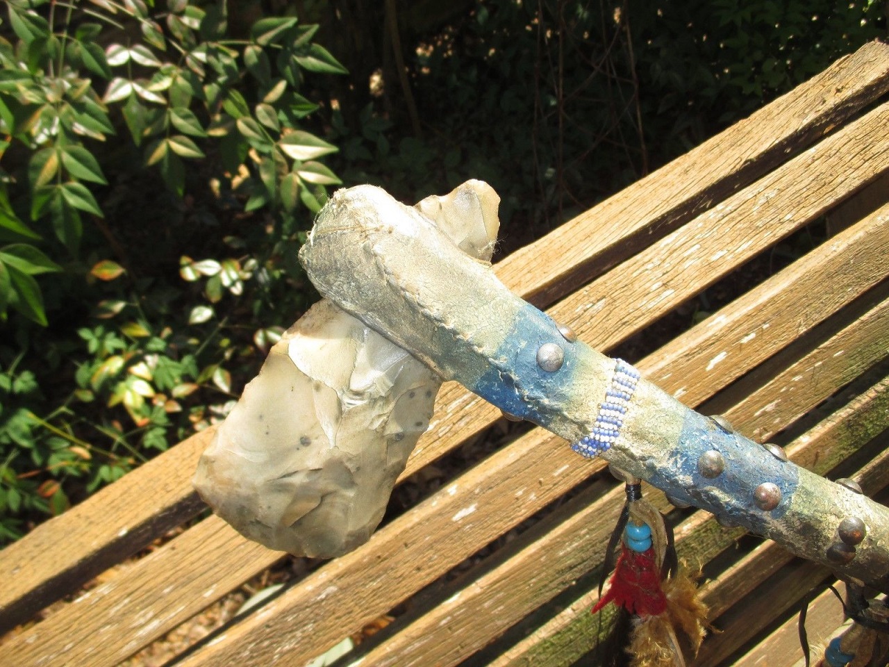 I am making a photo comparison of these two pieces. I could argue that we accept derivations of a standard form of weapons from every culture weapons come from, so why not Native American? I am adding a lot of links about trade pigments and the use of laundry blue to paint artifacts. It is clear that some bluing pigments would have been available from the earliest trade contacts on the northern plains and latter from the mid 19th century synthetic blue and latter other synthetic pigments. I think these pictures show some differences in age and conception. One appears to me as ridged and over done. I feel the one a have shows a more free form. The brass tacks spiral around the wood haft. The whole design is more thoughtful and considered. On close inspection the the two pieces are quite different.