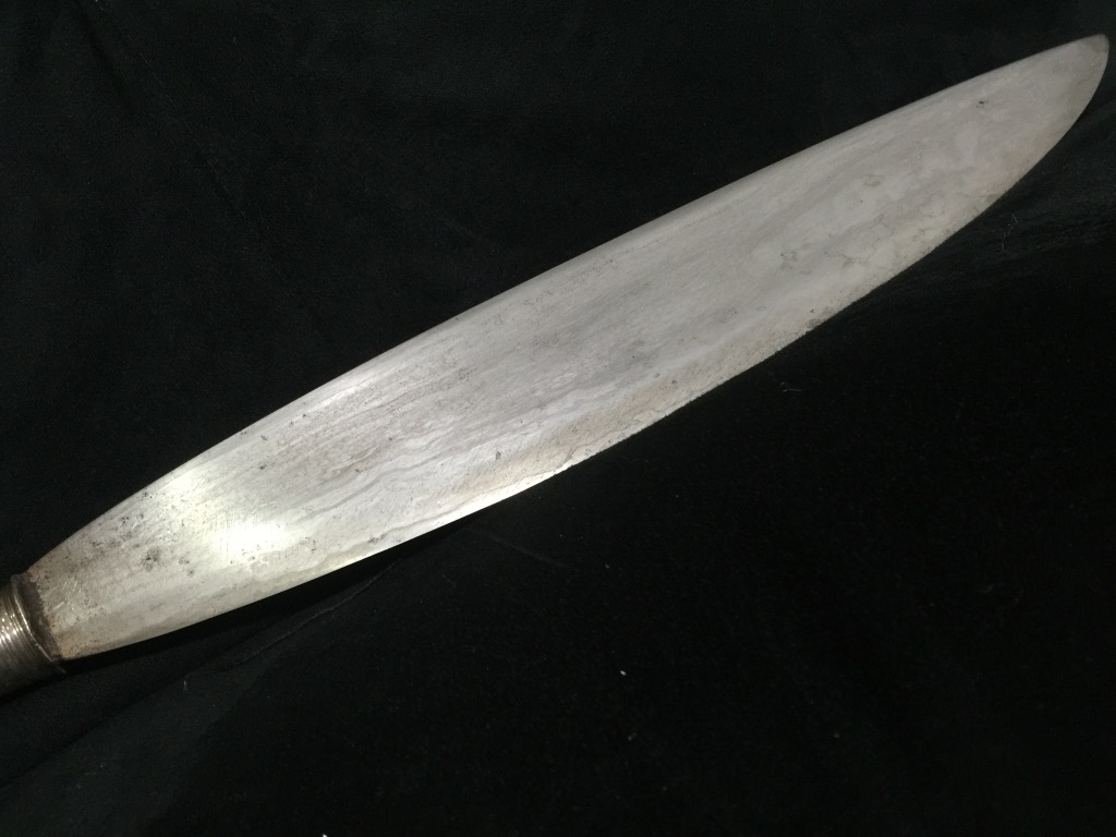 Clearly no twistcore, but a nice lamination indeed. I need to etch it deeper to bring out the full pattern but ran out of vinegar. Will continue the etch next week (and might re-polish the whole thing - there were plenty of deep scratches left from an old sharpening).