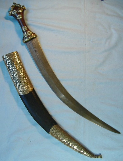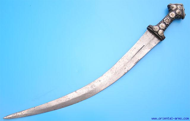 Here is a long Arabian jambiya style dagger that looks to be of the type from western Arabia, Hijaz. The blade style and hilt quite fit the style from that area, but the blade is surprisingly of wootz, though of lower quality.