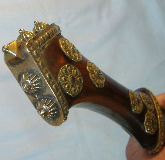 Being that the Arabian peninsula was at least nominally part of the Ottoman Empire, these style combinations are not particularly surprising, but I find the style combination with the rather are Arabian wootz blade most interesting. Note also the belt loop that seems to dictate that the brass woven seam side of the scabbard is worn to the outside.