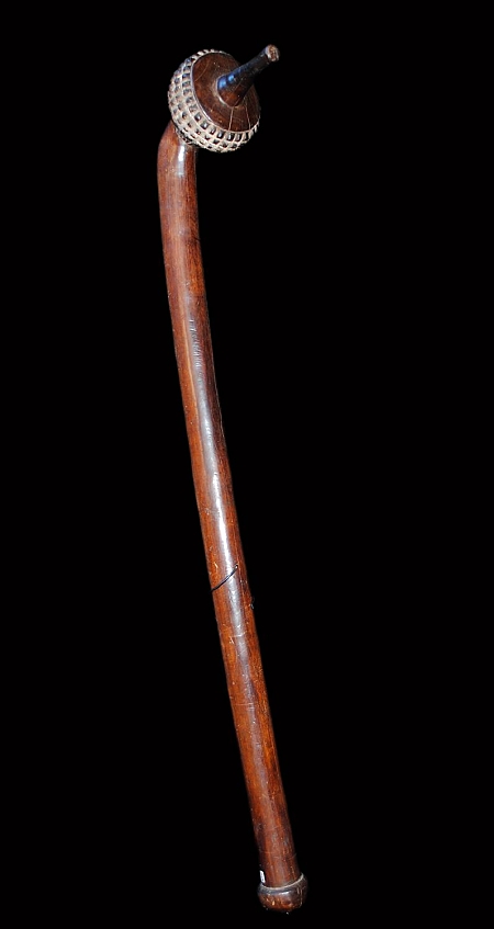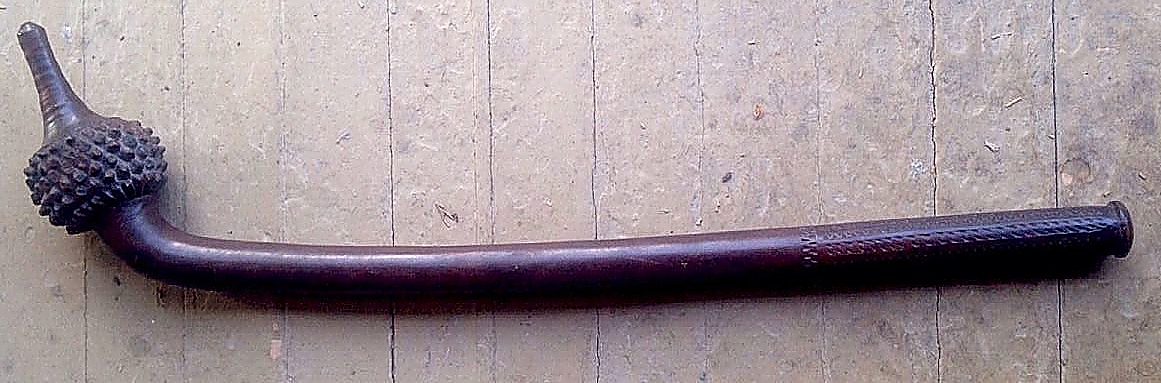 I recently acquired several clubs; among these is what I believe to be a Fijian KiaKavo Club. These have been referred to by some as a "Dance Club," however this one is so massive & heavy that is not conducive to dancing; it measures 38" long and it has a 7" circumference on the smallest part of the handle.