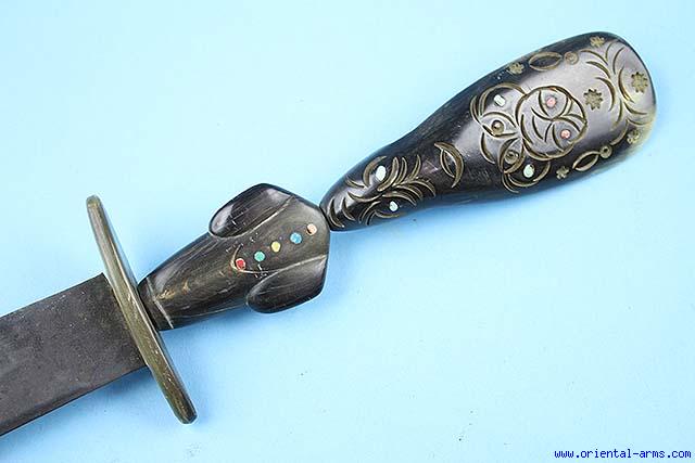 THESE COME FROM GUATEMALA IN CENTRAL AMERICA. THE HORN HANDLE AND FIGURE ARE TRADITIONAL FOR THESE, MOST YOU SEE ARE SMALL DAGGERS. THERE MAY BE A POST ON THEM IN THE FORUM TRY A SEARCH FOR GUATEMALA.YOURS IS A NICE EXAMPLE.