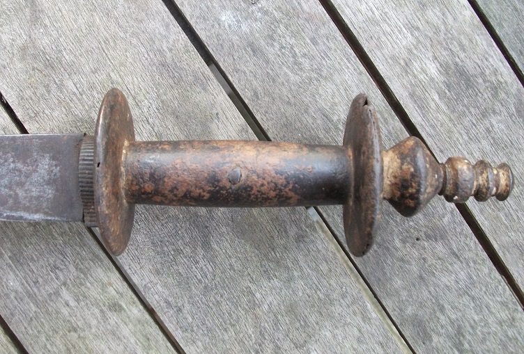 Thickness of the blade in front of the hilt is just under a half inch, and this tapers to about a quarter inch at the end of the blade. When wielded with force, I believe the tip would easily pierce most armor of the time. These are more like an axe than a sword.