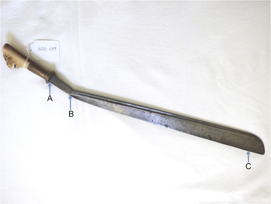 Thanks for the information. Dimensions of the blade at the three points shown in the picture. A: Just in front of the hilt Width = 1.4 cm, Thickness of spine = 0.9 cm B: At the angle in the blade Width = 1.1 cm, Thickness of spine = 0.8 cm C: At the widest point of the blade, just before the spine curves down towards the tip Width = 4.1 cm, Thickness of spine = 0.35 cm In each case the blade width was measured at right angles to the cutting edge at that point. Ian. . Last edited by Ian; 15th February 2018 at 02:32 PM. Reason: Spelling |