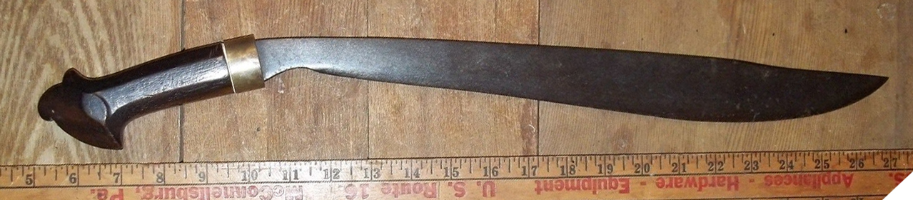 I'm just catching up with your added pictures. Others have pointed to this being a somewhat unusual talibon from the Visayas. The slightly clipped blade and the atypical hilt suggest that this one is not from its usual place of origin in the Eastern Visayas (Samar, Leyte, etc.) but is probably a Western Visayan form. The "eared" pommel resembles some of the 20th C. pommel versions of sundang, tenegre, etc. from Panay. Clipped blades are also more common in the Western Visayas. The chisel grind to the blade pretty much says it is Visayan in origin, although there are blades from Bicol and Batangas with chisel grinds too. Ian |