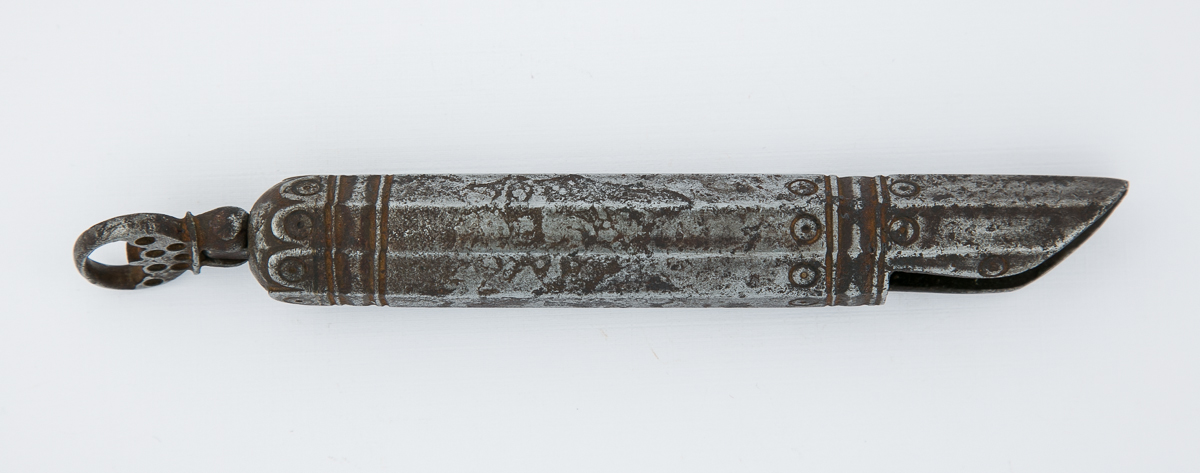 here are a couple of powder measures and some with ammunition belts. The pic with 2 measures the top is early turkish mostly likely 17th century. The lower piece typical afghan and the belts are also afghan. Iron is harder to work than brass. You must member there were 3 major afghan wars the 2nd in 1890's and the 3rd in 1919. General rule is that powder was more refined later and smaller amounts could be used so the measures were smaller. Much of the moro armor you see was used against McCarthur in the early part of the the 20th century, The afghans were still using Jezails thru the 1980's, The vietnamese were still using flintlocks in the 1960-1970's. Late is not bad as log as it is put in perspective and context. I am not saying tourist or religous recreations pieces are the way to go, but well made indegous pieces are worthwhile whether they were made in the 16th century or 20th