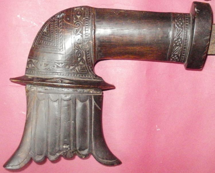I know that this type of sword has been covered in the forum but, because I never thought I would get one, I wasn't paying attention. I would like to know the names for the sword and for the people who used it plus any forum links that members may be able to provide. My sword blade is 18.75" (about 47.5cm) long and the pamor is good. The hilt is made of two pieces of horn that have been pinned (with a single nail) and glued together. The sheath may be newer than the blade and the hilt but the horn sheath throat matches the hilt which may indicate that the sheath was made for the sword. The drag is a contrasting piece of wood and may have been separated from the shaft by a horn or bone washer.