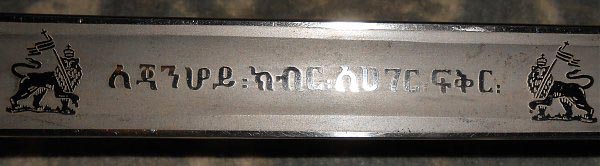 If is recall correctly, the Ethiopean Imperial guard used a sword that looks much like a 1796LC or Blutcher with the Ethiopean Lion and amharic lettering etched, were generally carried in a fairly plain locally madeblack leather scabbard by the well dressed and properly western style dress-uniformed guardsman, who did NOT wear shoes. They ran, marched everywhere, at speed barefoot and I gather, quite good warriors. Just not enough of them. The OP's sword may have been captured from the Italians.