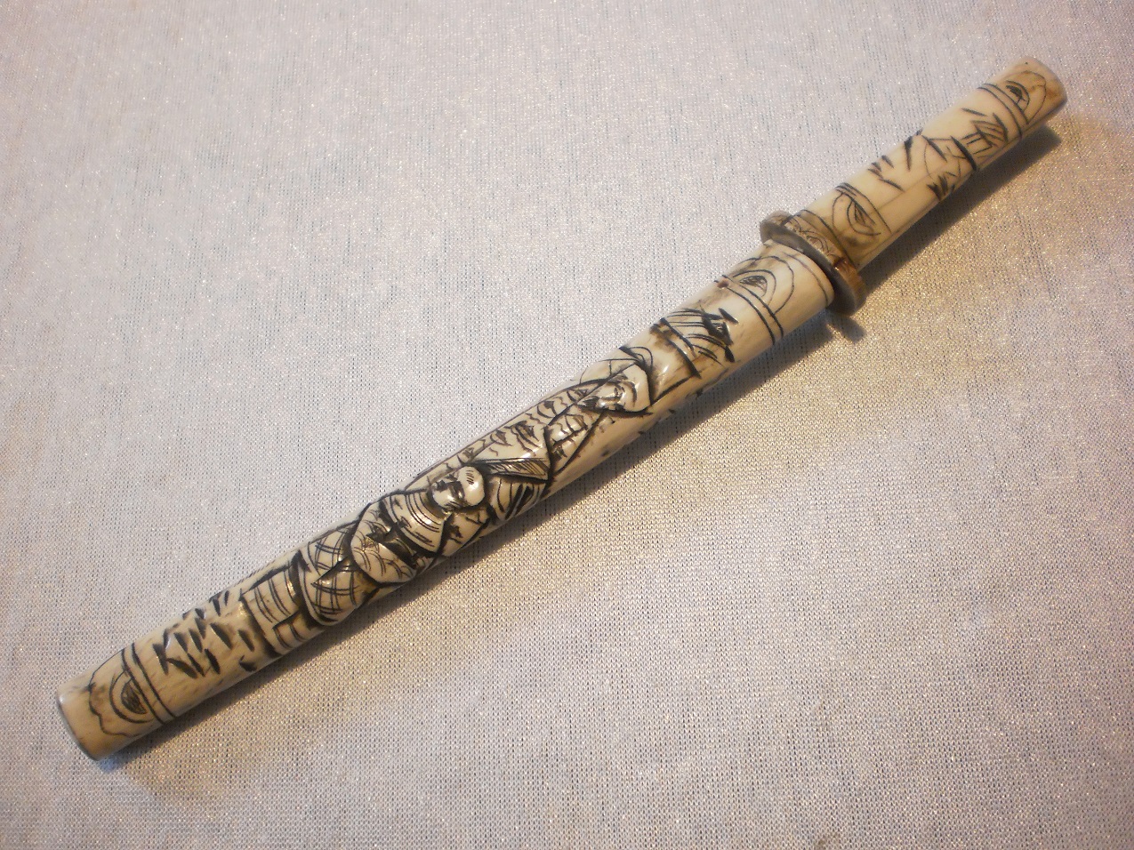 At first a small katana made of bone. Length overall: 19,5cm without scabbard: 16,5cm |