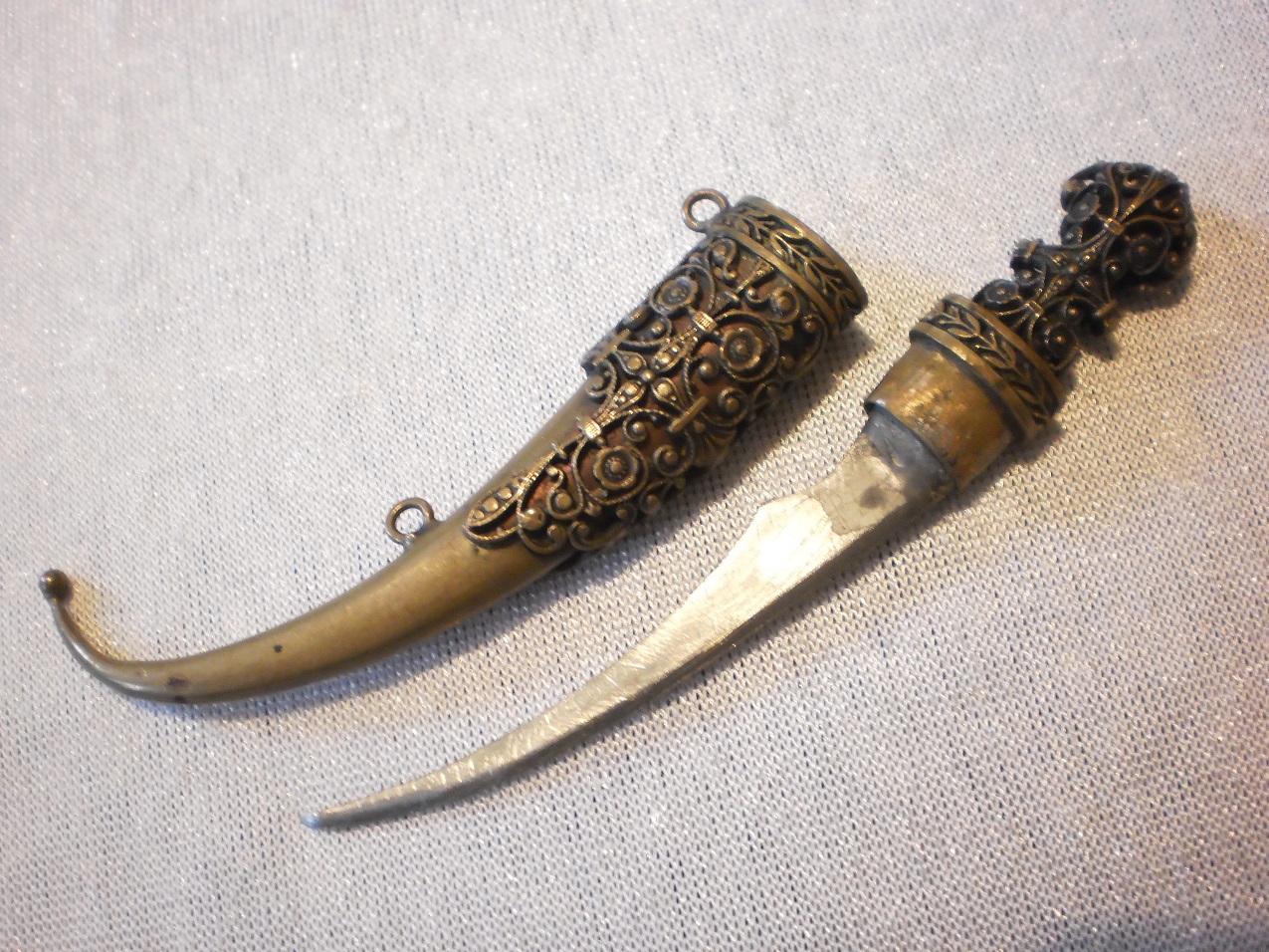 Mr. Sajen, มีดหมอ is perhaps the Thai word commonly used to refer to such articles. I find it transliterated as "meed mor". The transliteration into Latin letters may or may not accurately reflect the actual pronunciation. I find the word translated variously, on assorted webpages, as "knife", "lancet", "doctor's knife", "exorcist's knife", or "sorcerer's magic knife". The richness of the nuances of meaning can be lost in translation. A few of the problems with translations are: they may be a "rough and ready", improvised, or ad hoc solution intended to convey the "general idea", Mickey Moused up by a non-linguistically inclined layman who, in addition, is no "gunpowder inventor". Certain subtitled movies sometimes illustrate this; movies with the original audio of the dialogue dubbed over are even better, and so much worse. The "word-for-word" translation is, in some languages, an impossibility. In those instances where it can be pulled off, the end result in the target language sometimes reads like a wooden shoe that's too small. Unless it's explicitly stated, I'm left guessing as to whether the intent was to translate as literally as possible, to convey the meaning of an idiomatic expression in the source language, to interpret, or some ad hoc/ improvised/ variable/ combination/ "play it by ear"/ "fly by the seat of the pants" method. How does one convey the meaning of "mumbo jumbo" into Swahili? Is "hoc est corpus" an accurate translation into Latin of "hocus pocus? Is "abracadabra" a good interpretation into English of "sim sala bim", or would it be best to leave it untranslated? Should "alakazam" be translated to "sim sala bim" if German is the target language? If I don't know the source language of a word (it's not necessarily the same as the language of origin of the word), translation or interpretation of "nostrum" or "patrem" are shots in the dark. "Sama suku" from Bahasa Indonesia to Finnish and vice versa is the only example which comes to mind that doesn't present very much of a conundrum. I think I recall that Bambang Harsrinuksmo in "Ensiklopedi Keris" gave specific measurements which enabled one to distinguish a patrem from a "keris proper/ standard keris", and a patrem from a keris jimat. The really tiny ones (<8cm. or so) appear to be made of brass and/or (I'm guessing) some other kind of copper alloy which can be patinated almost black.. I doubt very much that it's swasa, or any other alloy containing Au or Ag, though I could be wrong. Pics can be found by Googling "keris jimat". Does anyone know what metals are used to make these, and the technique used to achieve the contrast in colours? |