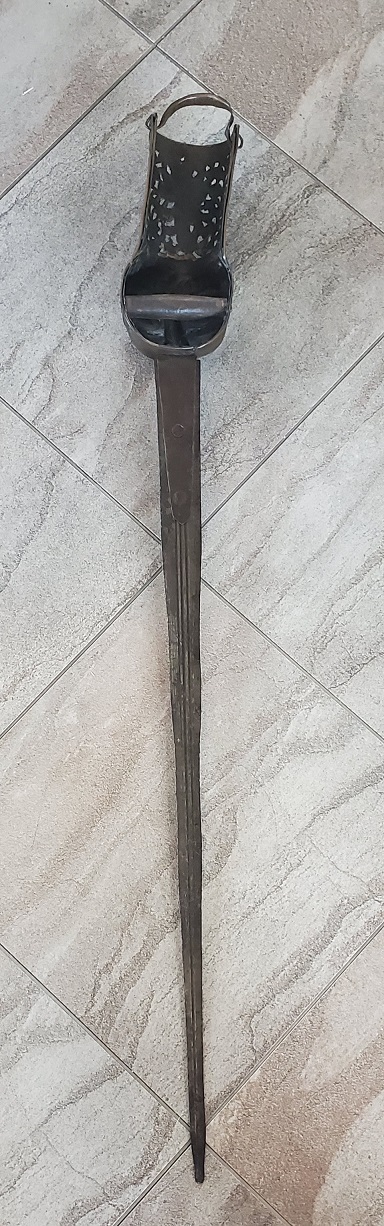 European double-edged blade wit a single wide fuller and a " Genoese"/"Styrian"/ make your guess. trade blade. Blade is marked , see last pic. No Indian ricasso, blade length 34 " Good and complete basket handle with intact baluster and leather-wrapped hilt, old, practically congealed leather, if not the original, then definitely from the working life of this Firangi. Last edited by ariel; 5th September 2021 at 05:39 PM. |