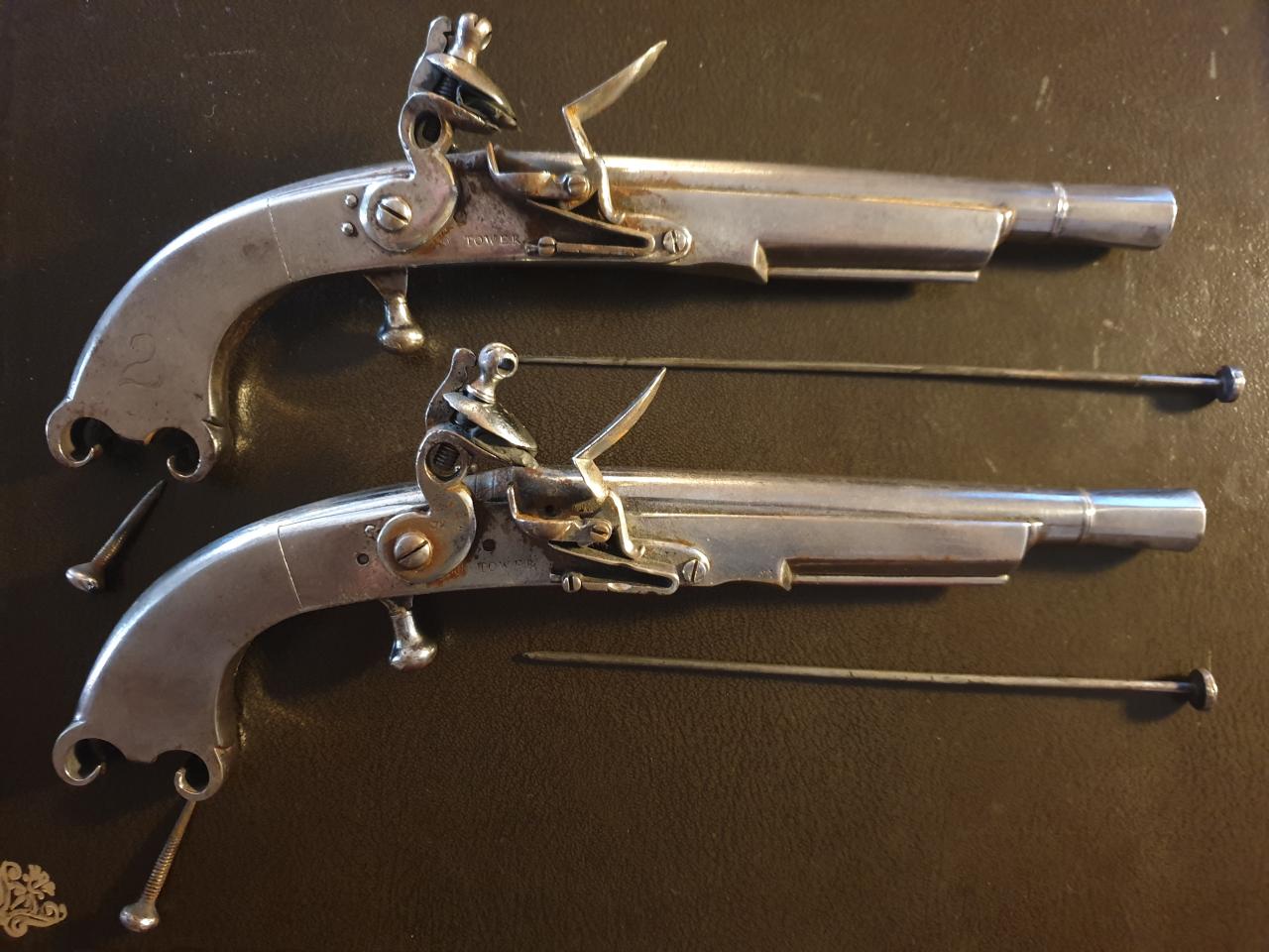 Admittedly the quality doesn't look great and the stamped (?) Tower difficult to account for . But . A lot of Scottish pistols were in fact made in Birmingham . Bissel was prolific maker . Paradoxically a lot of modern reproductions copy Bissel type pistols from the 1770s because they are relatively plain and easier to reproduce than the engraved Scottish examples. The attached shows a late pistol by Bissel which like the pistols under discussion has a military style ring neck cock and the later style of cock spur. It's from Edinburgh castle so I think we can assume it's authentic. The two screws visible behind the cock of the pistols under discussion follow nineteenth century practice. Scottish style flintlocks with German silver stocks were being made in Birmingham the 1850s so we can assume these were regimental regalia following the fashion for all things Scottish in the early victorian period. What looks like a 2 on one pistol might have some regimental significance . On balance I can't see why these are not nineteenth century Birmingham made pistols possibly slightly out of period . Probably irrelevant but the old name for the Birmingham proof house was the Tower.