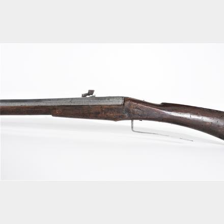 The stock retains its metal nosecap, as does the ramrod. The barrel is octagonal to round with parallel incised lines ahead of the heart-shaped rear sight.