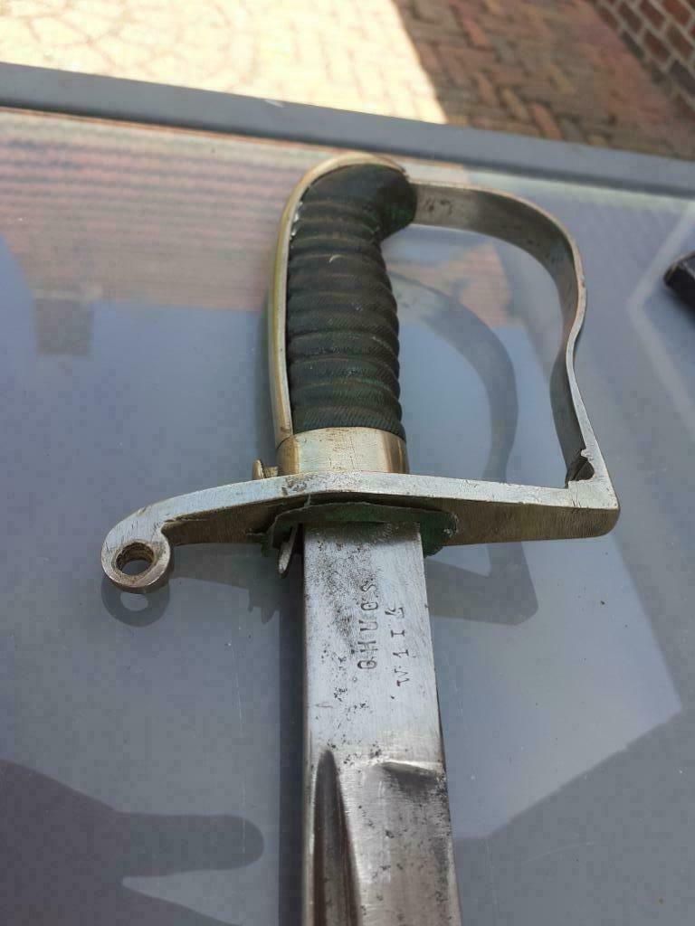 It's about 74cm long out of the scabbard. POB about 9.5cm from the guard. The blade is not sharpened, or possibly blunted (has about a .5mm edge; no patina and some file marks on the edge that are hard to capture on camera). I can't comment as to the quality of the steel but it has significant distal taper, from 8mm at the guard to about 3mm at the end of the fuller. It has a few seemingly random letters stamped into it QHUOS and below it W1I and then an upside down 7. The guard seems to be nickel plated. I think the grip wrapping and washer are some sort of imitation sharkskin and they're not very substantial. The pommel has an obvious nut and bolt construction, but I haven't tried opening it up for fear of damaging something as I am a novice. The scabbard is rather thin metal and seems to have been blued. The rings are on the inside of the curve, and it has a working locking mechanism that fits the button/clip on the guard. At first I thought it might be a replacement blade on an old D-guard, but the scabbard is clearly made for it. I'd love your opinion on it... Since it's a sickle sword and I got it from an area near Belgium, maybe central African (Congo, Ethiopia)? European late 19th/early 20th century april fool's joke? Modern day smithing experiment? Last edited by werecow; 29th January 2023 at 07:46 PM. Reason: Added pics of sword out of the scabbard |