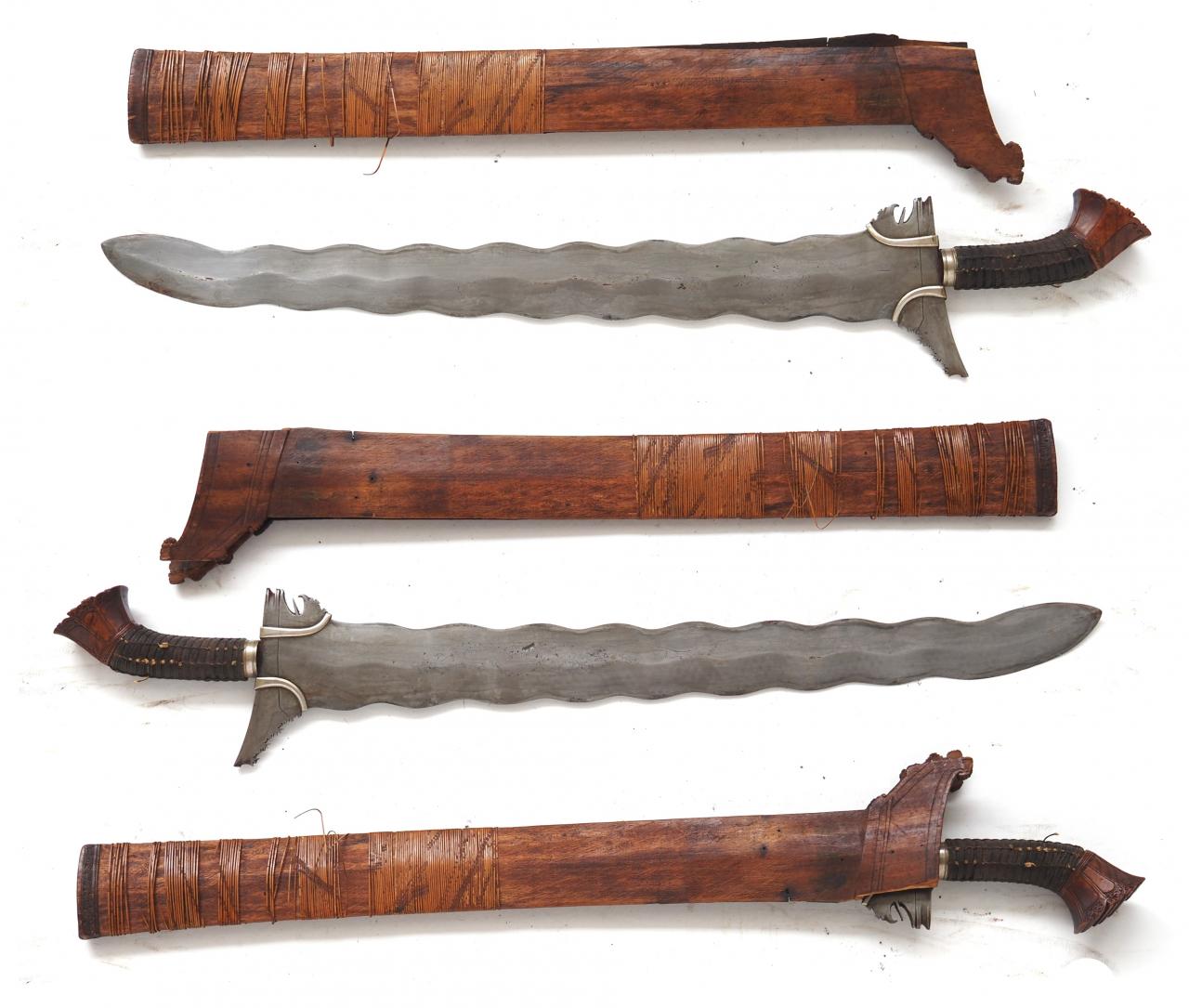 It's interesting that all of these "horse hoof" pommels are accompanied by hilts reflecting other features of mid-20th C production, most notably the type of wraps on the grip section of the hilt. This is true for the bangkung as well. These all appear to be of Sulu origin. Whether the blades predate the dress is hard to say. I've seen old kris blades redressed in this style, similar to Sajen's and Jeff's examples.