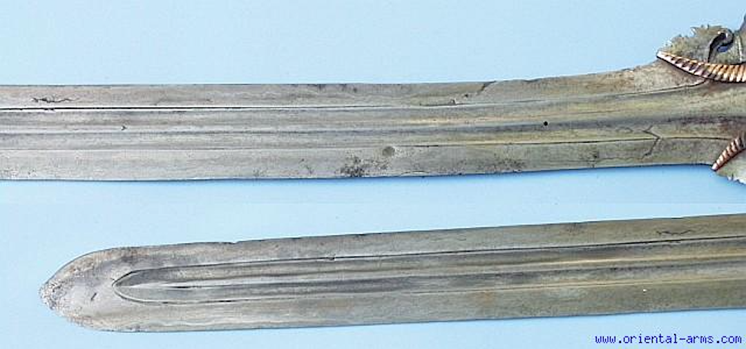The quality of these blades can vary quite a bit. The first blade exhibits pretty poor cold work and is most likely fairly young (despite the hole in the central fuller - probably bad judgement by the worker). In this case, I'm not even positive that it represents genuine native work (vs. Madura/etc.). Fittings are also modern.