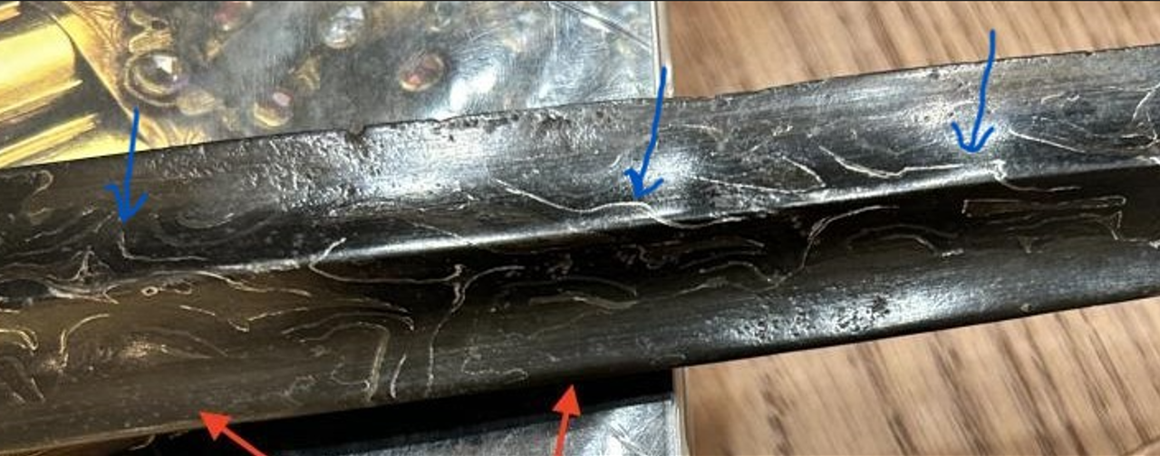 In the overall view picture of the blade I have marked 4 places, where we see, how the frequencies of segments (defined by gedhegan work or by twists, or by whatewer) are becoming wider towards the middle (and afterwards even more wider toward the tip, outside this picture). This is not a picture we would expect to have of a Gedhegan work, which is done on a cold blade already forged out, and where the frequency between places, where surface is manupulated, is kept more even,- or would be even reversed - with bigger spacings on Sorsoran, becoming narrower up the blade. On a blade made with a Pamor of twisted bar(s) we would normally have that, what is the case here - narrow frequency on Sorsoran, which becomes bigger and bigger up the blade - because the Pamor is forged out together with the hot blade. Of course an experienced smith, or let's say, smith, who cares about an "as eaven as possible" appearance of a twisted bar Pamor, works against this occurence - to have a pattern with more eaven frequencies. I also don't see classic twist joint features on this blade, but there are at least two places in this one picture, where it comes quite close to these (marked by blue arrows in the cutout pictures; the pictures with blue marked areas show the borders between possible twists, in this case the narrow frequencies close the base of blade). As I have said, Odo-Odo can disturb the appearance of a twisted bar heavily, as does Sangling here and there - the thinness of Pamor layers in this case goes into a small part of a millimeter at some places. Last edited by Gustav; 18th August 2024 at 06:31 PM. |