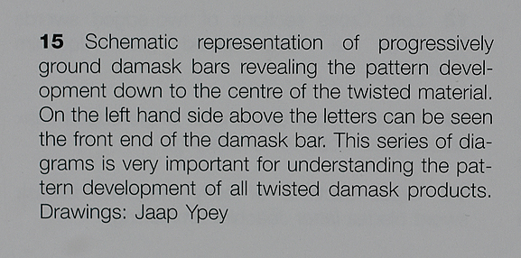 I'm still not interested in trying to convince you that my opinion is correct & that yours is not, I respect your unfettered right to hold your own opinion, & I do understand how you have come to hold this opinion, however, I feel that others who are perhaps not as well informed as you are might benefit from what I have posted here. The drawings of a twisted bar at various stages of its reduction to its center, & the caption that goes with the drawings, are from Sache's book "Damascus steel", you would be familiar with this, but many other keris people would not be. I started doing forge work in about 1978-1980, by 1982 I had found a teacher, I first made a dagger with pamor construction in about 1983, & immediately after the dagger I made a pretty funny looking little keris. By 1988-1990 I was doing the sort of pattern welding that is demonstrated in the Sache drawings, it was all damascus work. I did try several times to apply twisted bar as pamor, but I was never very successful, however, my twisted bar damascus blades were more than acceptable. I sold most of my damascus work to other makers to be turned into knives & daggers. The teacher I found in 1982 was Gordon Blackwell, he taught me to forge weld, but I taught myself to forge weld high carbon steel & nickel & to combine these materials into a single billet. I found another couple of teachers in Solo, my principle teacher was Empu Suparman Supowijoyo, my long-time friend Empu Pauzan Pusposukadgo also taught me, but only by observation & his explanations, I never worked under Pak Pauzan's instruction. In addition to this I have observed the work of four or five other pande keris in Central Jawa, and four or five pande keris in Bali. All of this Javanese/Balinese teaching & observation was between 1980 & 2023. I stopped doing forge work in about 1995 when I moved to a new house and got so busy with other things that I never got back to serious forging. I currently have only a small hand blown farrier's forge, & the only forge work I have done in recent years is heat treatment of blades I made in the past, and teaching of a few people who wanted to learn basic forge procedures. The big difference in working with damascus & working with pamor blades that have a laminated steel core, is that with the pamor blade you have only a comparatively thin layer of contrasting material and you need to forge out the entire blade to its intended length without deforming the pamor pattern, then when you are doing the cold work, you need to be extremely careful not to cut all the way through the pamor and expose the solid black of the core. If we use the construction method of an inserted edge, rather than an enclosed core we can avoid that core exposure problem, but I don't think Javanese makers have used the inserted edge since about 1700, & not all makers used it then. If we look at the Sache drawings we can see that only a very few layers of contrasting material have been used, & enclosed by thicker layers of homogeneous material. By the time that we have reduced the fully twisted bar to somewhere near its center we have removed all the closely spaced outer layers, & come down to the more widely spaced inner layers, as can be seen in illustrations J & K of the Sache drawings. In these J & K illustrations we can see an almost straight line of homogeneous material running through the center of the bar, in damascus with few layers in the original material, it is possible to achieve something more or less like this, but in pamor where we begin with only a tiny amount of contrasting material it is virtually impossible to produce a continuous line of the white contrasting nickelous material. These illustrations are related to European working capabilities, they do not reflect the capabilities & technology of Javanese and Balinese smiths. Nor do they reflect my own capabilities. All the forge work I did in Australia was done without a striker & without a machine hammer, and on a relatively small forge. In Jawa & Bali the forges are even smaller & more limited than what I used. In reality this beautifully crafted twisted bar in the illustrations is not representative of what can be produced by the vast bulk of smiths in Jawa & Bali. In addition, working with pamor we use very thin pieces of contrasting material ie, nickel or meteoritic material, a piece of the contrasting material used in most keris would be no thicker than a piece of newspaper, I used to forge out the nickel or cleaned meteor until holes appeared in it. The traditional method of welding meteorite used in Jawa is to enclose tiny pieces of meteorite in an iron envelope & then run that envelope through anything up to 7 or 8 folds, the number depending upon the number of welds needed to clean the material, this envelope process results in extremely thin layers of contrasting material. So with the Sache illustrations we have an example that is entirely different to what we work with in pamor production for a keris, with pamor we have a greater number of layers, and those layers are much thinner. Now have a look at the photos of keris blade section. The blade I have used for an example is one that was made by Pande Keris Yohannes Yantono, I prepared the meteoritic material for use in this blade and it was given to Yantono as a very small billet, he forged it to paper thinness before combining with iron and producing a pamor billet that contained a nominal 128 layers of contrasting material. The pamor motif is Wiji Timun, & this was produced by surface manipulation. If we look at indentations that form the motif we can see the same flow pattern in the pamor that can also be observed in the Sache illustrations J & K, but the flow pattern in the keris pamor is comprised of very many more layers than in the J & K illustrations. In the keris blade we can also see in the image of the sorsoran where the pamor has been totally cut through during the carving & the black core has been exposed. If we