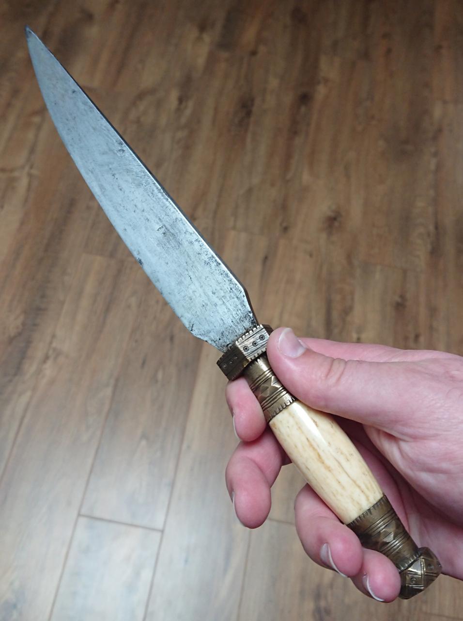 Snatched this sino-vietnamese fighting knife for 10€ at the flea market this weekend! I'm pretty happy it, since I didn't have one of those in my collection yet, and especially for that price! It's a long, heavy knife, with a very thick spine and slightly concave sides. Polish is pretty rough, don't know if it was always that way though. The grip is made of bone, with brass pommel and guard. I read that those were used by the black flag army, which would make sense since I found it in France (the black flag army fought the French during the sino-french war 1884-1885). Anyway, would love to hear your thoughts about it! 🙂 |