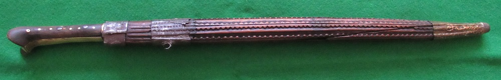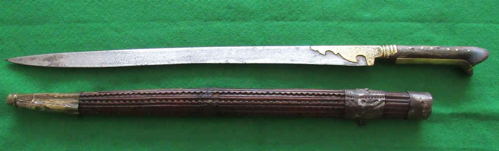 My friend has another one of these potentially earlier yataghans, but it is much bigger, at about 80 cm overall. Another difference is the dark horn hilt and the blade decoration, even if the blade also has layers of Turkish Ribbon.