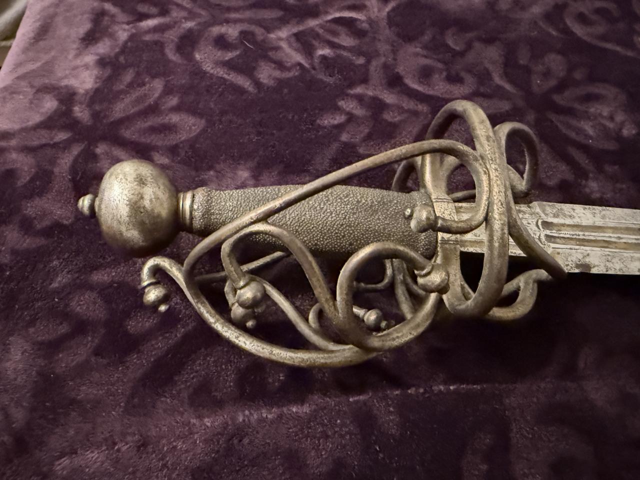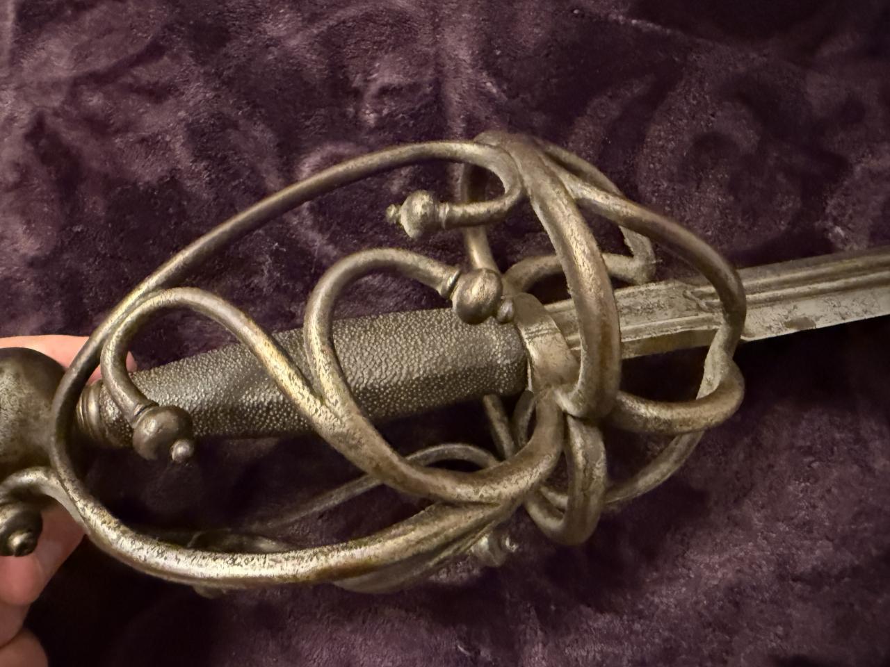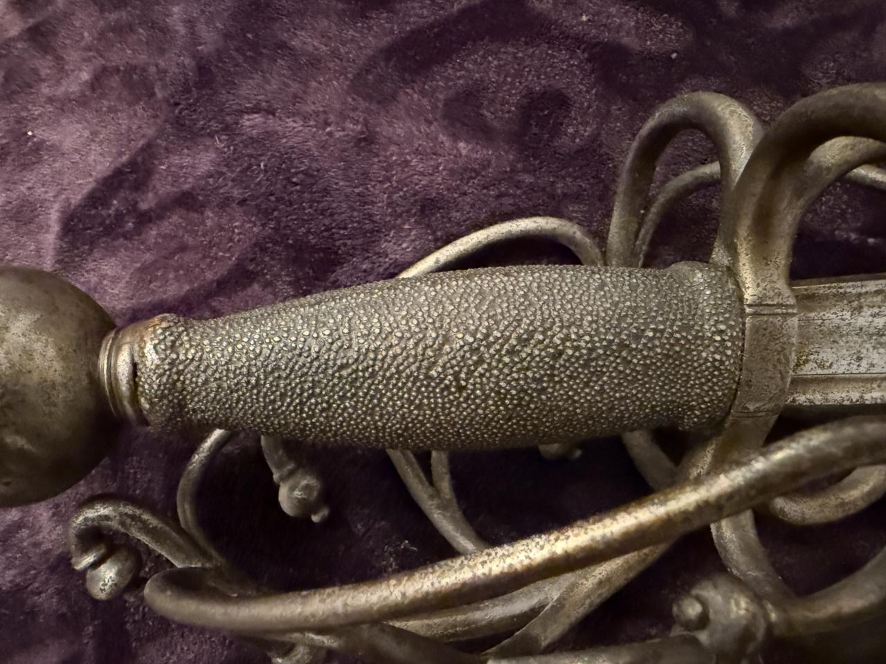 Beautiful sword. Wonder if it has some sort of Dalmatian connection? The basket shape overall reminds me of a delicate version of a schiavona and the grip must be shark skin (or possibly sting ray). Also I wonder if the wielder is supposed to hook an index finger over the riccasso hence the lower guard, and there’s no thumb ring.