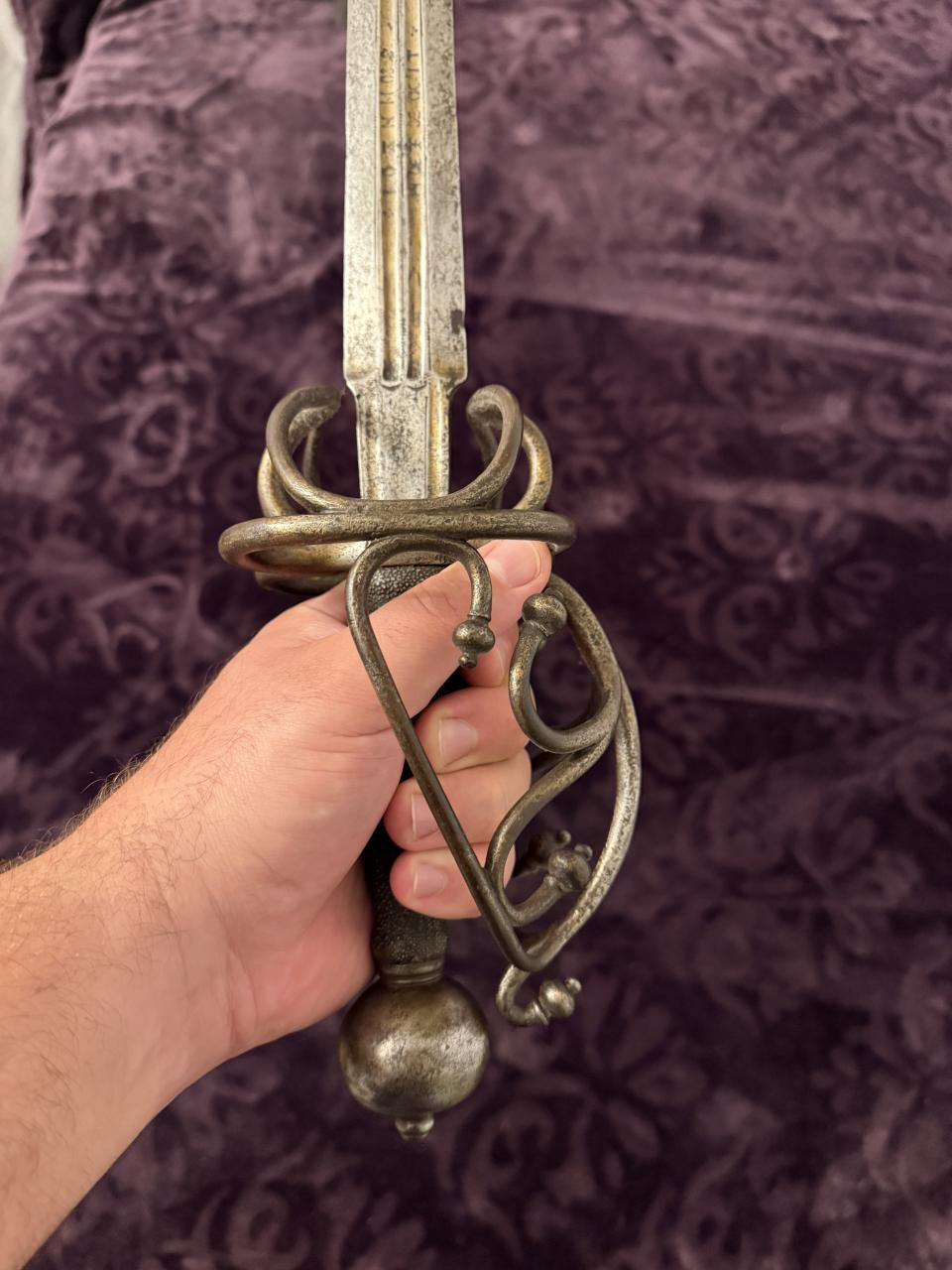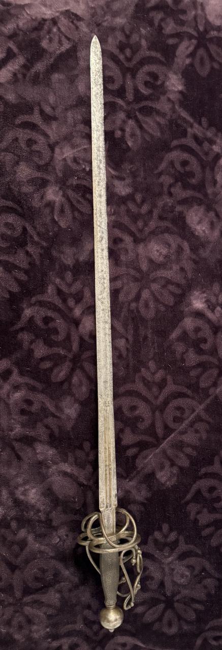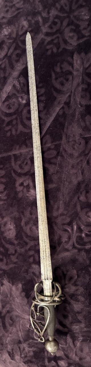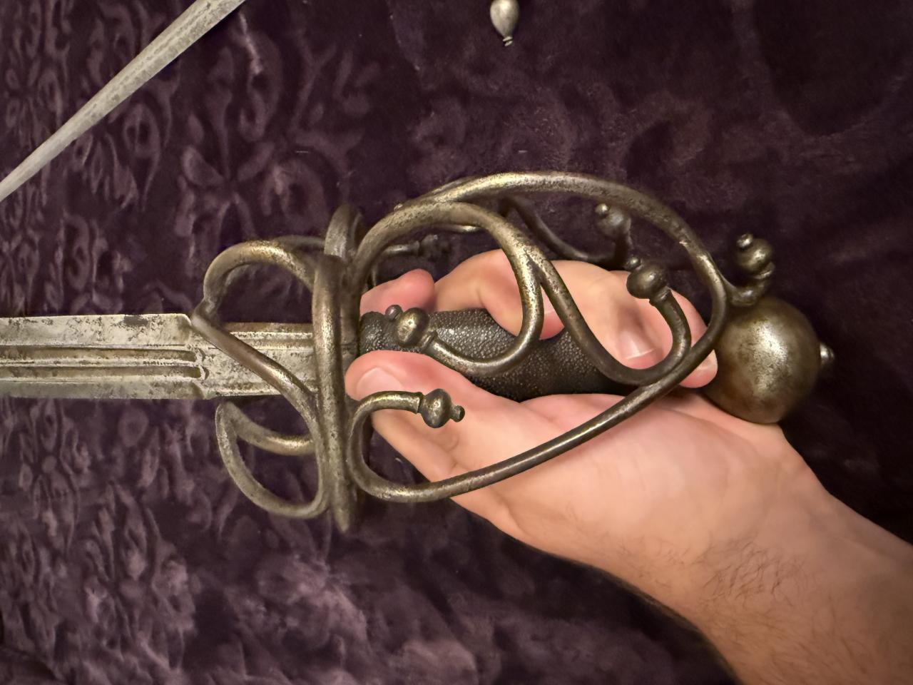 Beautiful sword. Wonder if it has some sort of Dalmatian connection? The basket shape overall reminds me of a delicate version of a schiavona and the grip must be shark skin (or possibly sting ray). Also I wonder if the wielder is supposed to hook an index finger over the riccasso hence the lower guard, and there’s no thumb ring.
