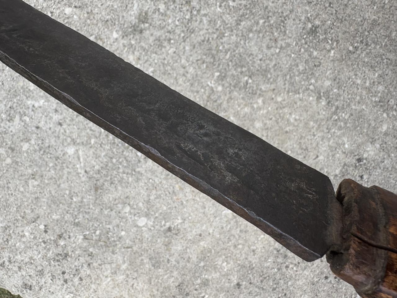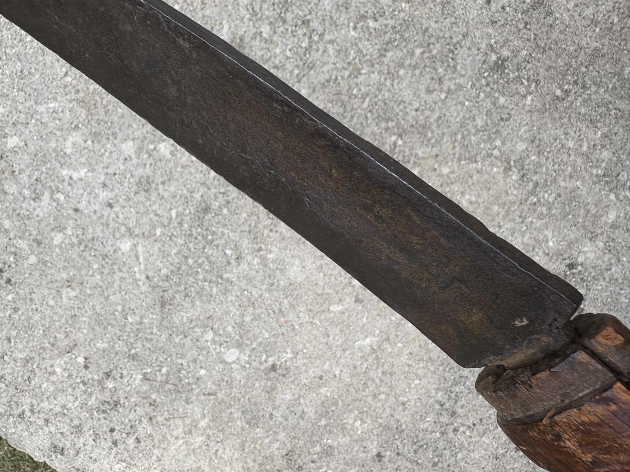 Of course! The blade is about 5mm at the hilt. The blade’s very rough and beaten-up, but it seems to have a double bevel. It actually curves forward slightly, with the spine in front of the rounded tip about in line with the center of the hilt.
