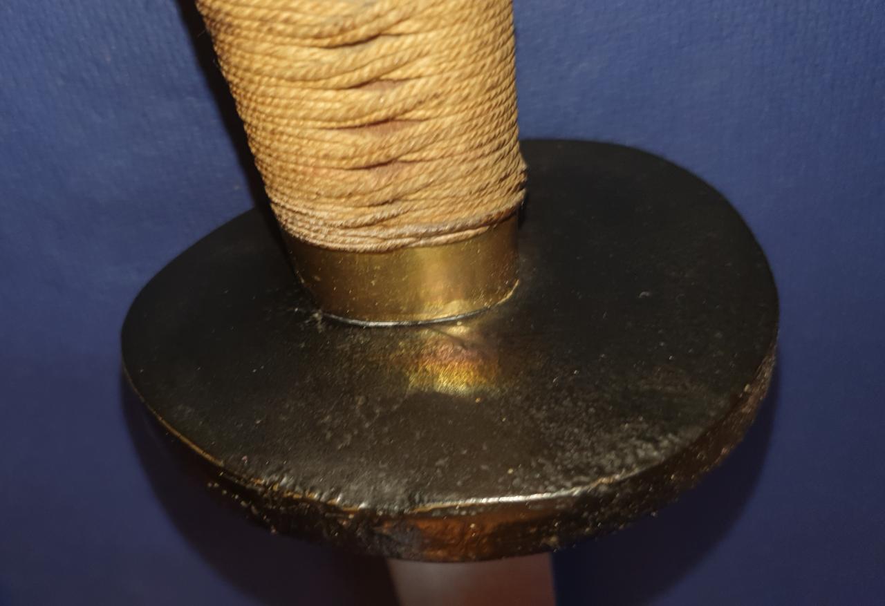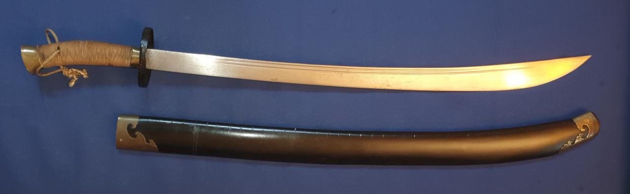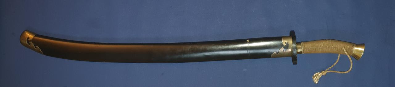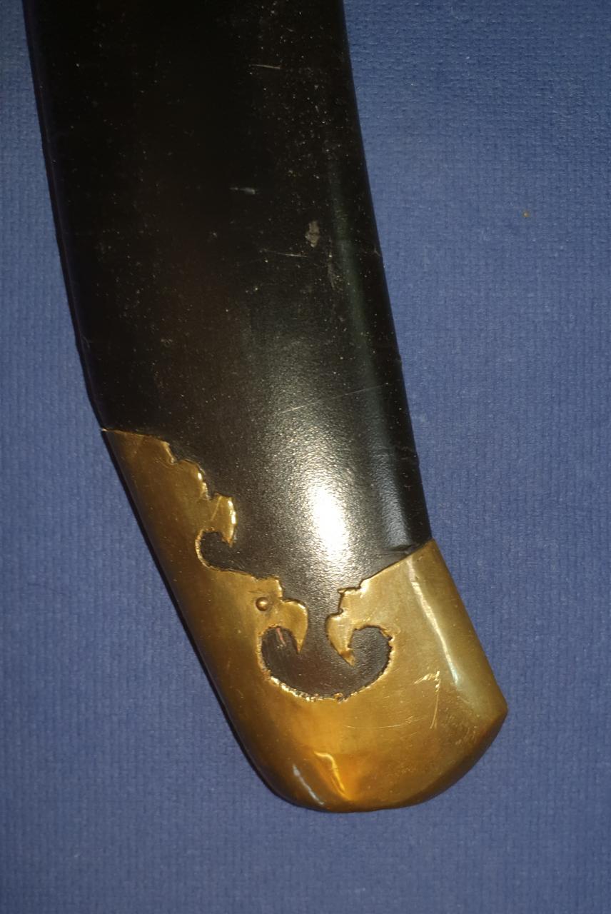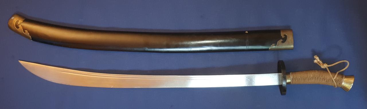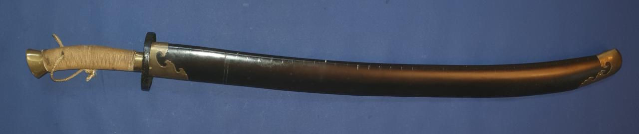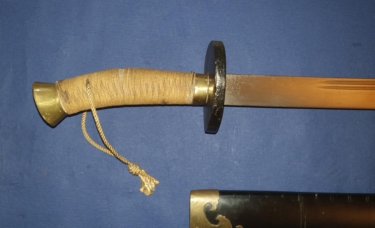 I am offering this antique Chinese Niuweidao. It is in the condition in which I received it; it has obviously been restored. This restoration is not what I like best. The scabbard, which was probably previously wire-wrapped, has been repainted. The brass end pieces are preserved and polished, but the mountings for the carrying strap are missing. The grip mountings are also polished, while the cup guard has been repainted. The handle binding seems to be newly made. The blade has been polished, but still shows very fine pitting. The edge is quite blunt, likely due to removal of edge nicks. Still a nice Chinese dao, old/antique in all parts.