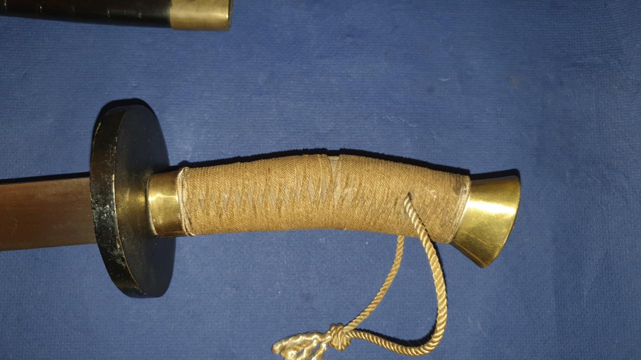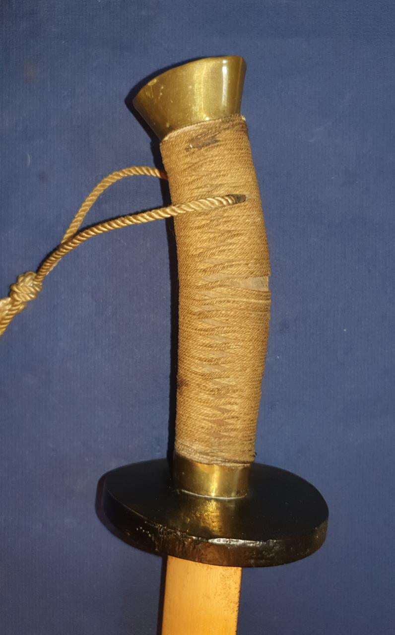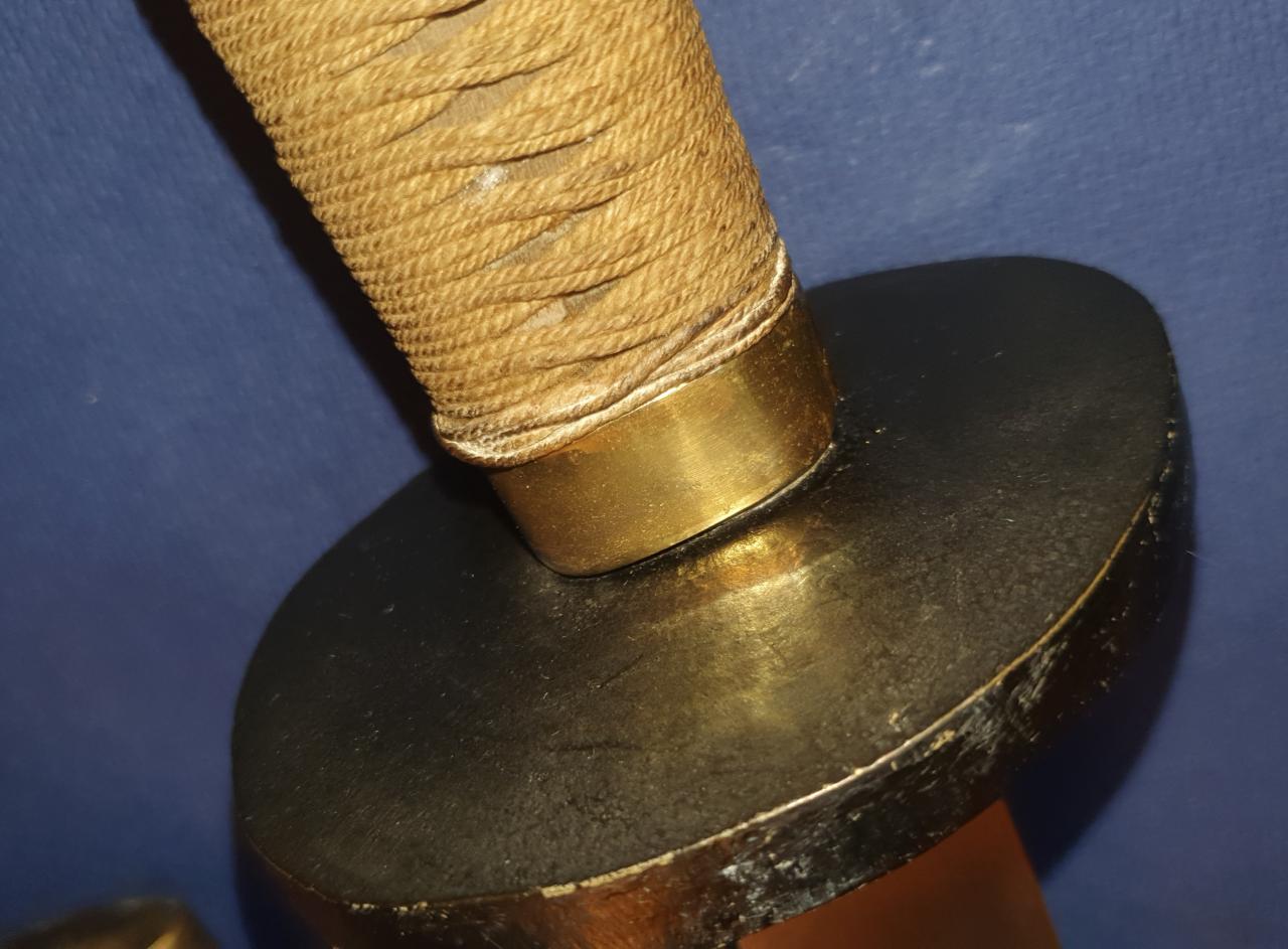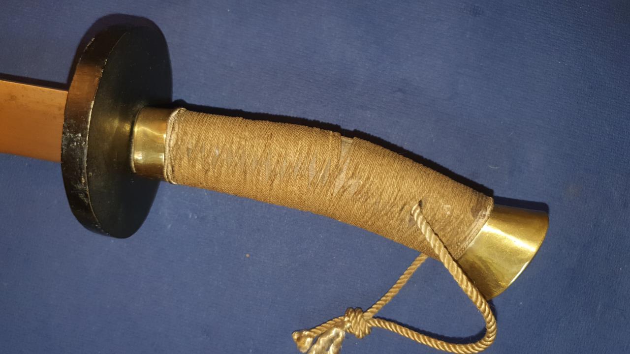 I am offering this antique Chinese Niuweidao. It is in the condition in which I received it; it has obviously been restored. This restoration is not what I like best. The scabbard, which was probably previously wire-wrapped, has been repainted. The brass end pieces are preserved and polished, but the mountings for the carrying strap are missing. The grip mountings are also polished, while the cup guard has been repainted. The handle binding seems to be newly made. The blade has been polished, but still shows very fine pitting. The edge is quite blunt, likely due to removal of edge nicks. Still a nice Chinese dao, old/antique in all parts.