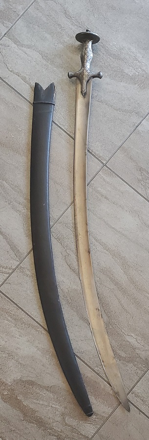 Also posted an Indian tulwar with steel Persian shamshir style hilt which also in this category of East India Company associated blade mountings, perhaps from Deccan, but at this point also the Punjab regions as well. This one has a British M1788 style blade. In the late 19th century, East India Company was contracting many blades of M1788 form to British makers. The foremost was Thomas Gill of Birmingham, but this blade is unmarked.