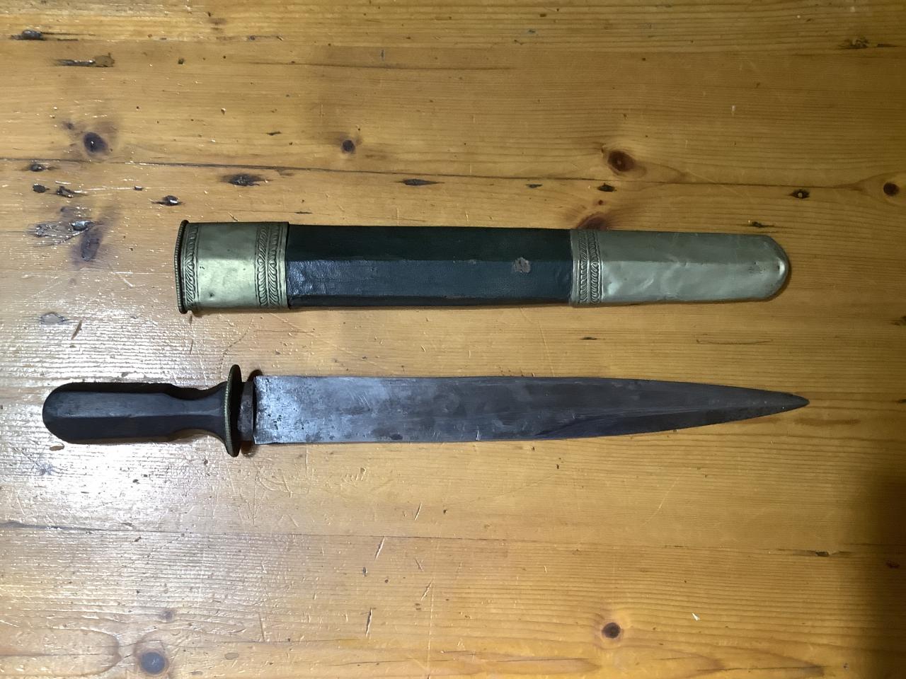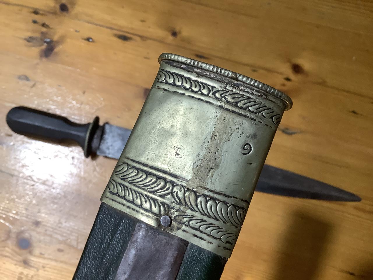 Posting a few pictures of a knife I inherited from my uncle, who passed many years back. I know he travelled to Nepal in the early 1980s and I assume he may have got it from there - but I don’t know. I was wondering if anyone could identify the likely origin or type of weapon? The blade has a false edge and quite a thick spine. The handle is dark wood. Scabbard almost has the pattern of skin, but could be paper based and the throat is wood. Metal (brass) parts on the scabbard are very thin and malleable with some decorative embellishments. The only marking can be seen in the attached photo - a swirl on the reverse of the scabbard. Hoping that someone can shine a light on the origin and age of this blade - as nobody in the family can recall its origin. Thanks in advance. |