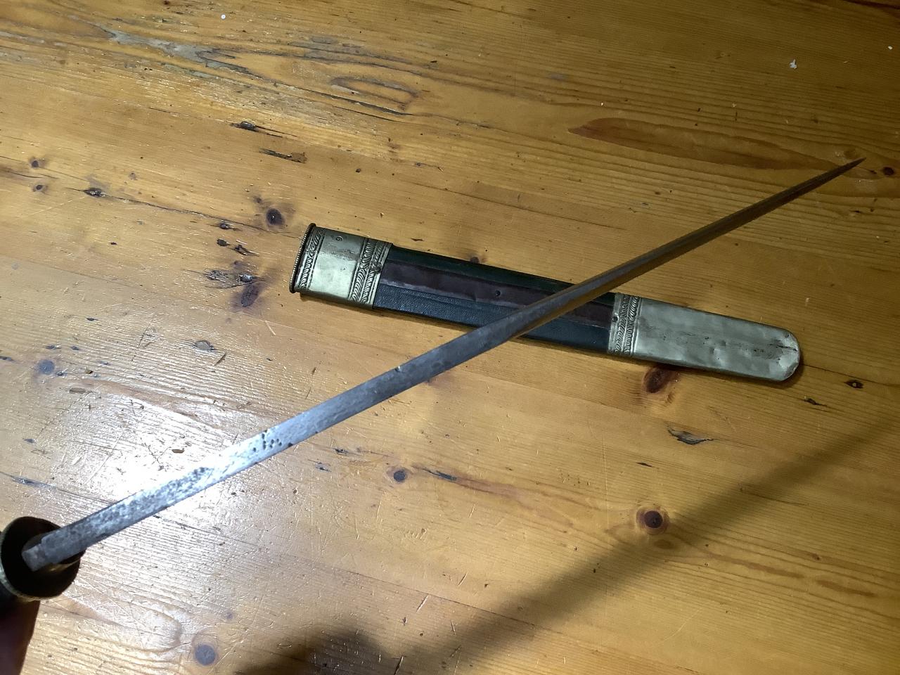 Thanks for posting another example of your inherited weapons. A nice heavy-bladed knife in what appear to be silver fittings. Again, I think you are on the right track with a Himalayan origin, although I think Bhutan or Tibet may be more likely as a place of origin. Please keep them coming! Regards, Ian. |