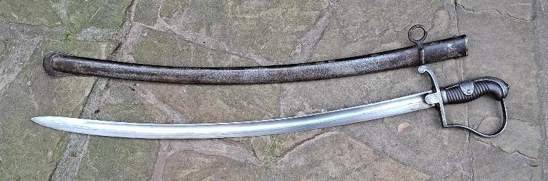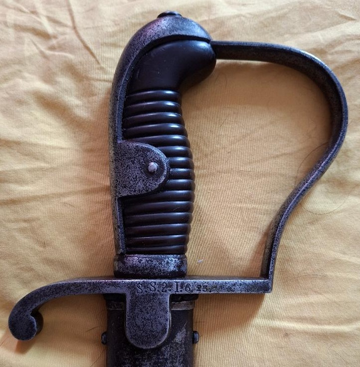 Here I have the Imperial German ww1 new pattern artillery sabre. I know the 1920 stamp is for acceptance post ww1. However the other regimantal stamps I have on idea. I had to clean this example. The sellers "dark patina" was in reallity a crust of rust. Fortounatly I think I have got it at the right time before deeper pitting of the metal. All the stamps are now visable and I hope I have achieved a balance between cleaning and keeping the age. The scabbard ring and strap projection did get rather too clean in parts. The scabbard still has black paint residue. I keeping with the rules I show the whole sword but it is the stamping that I would like information on. Sadly rather a nasty nick in the blade .