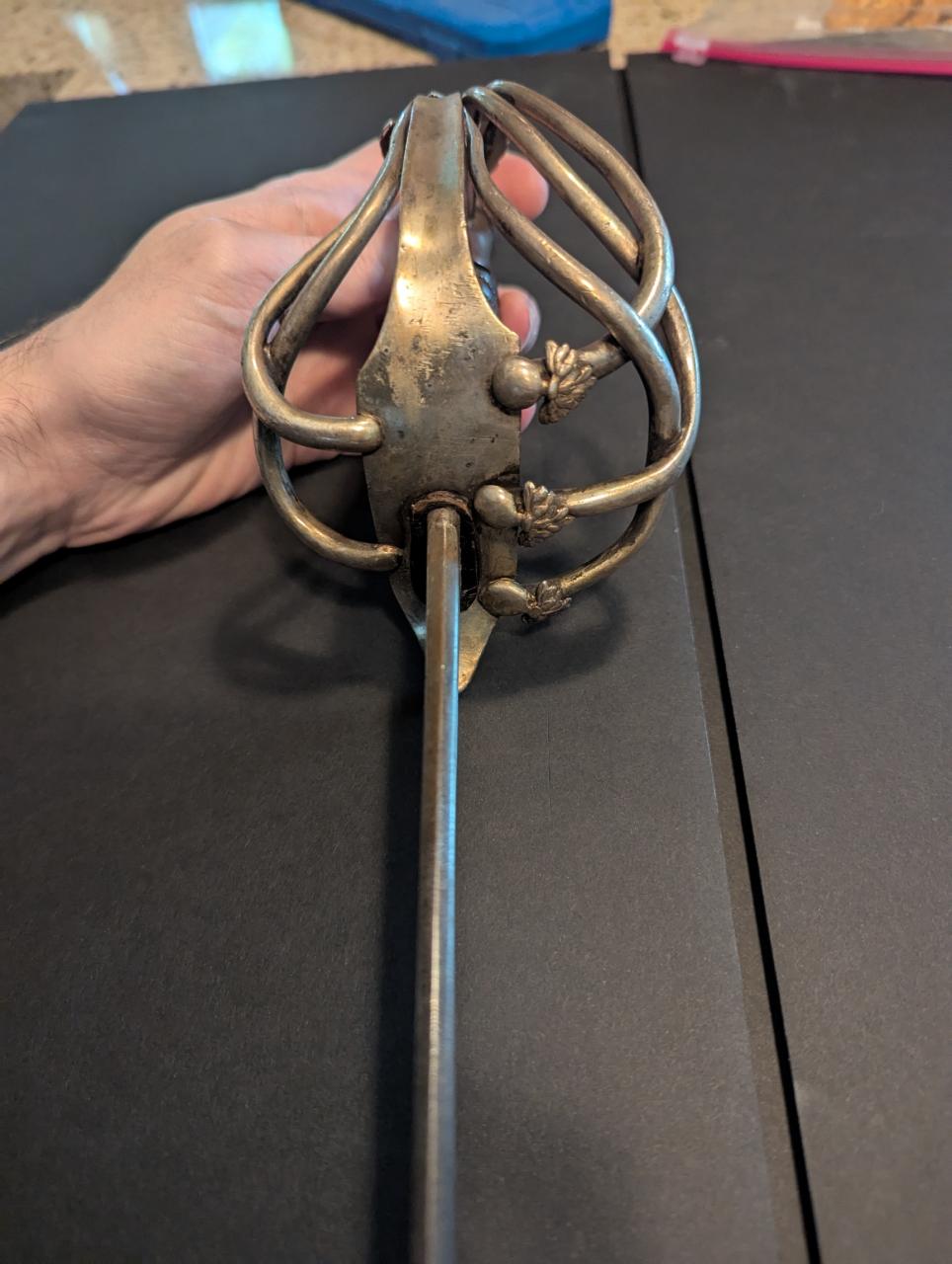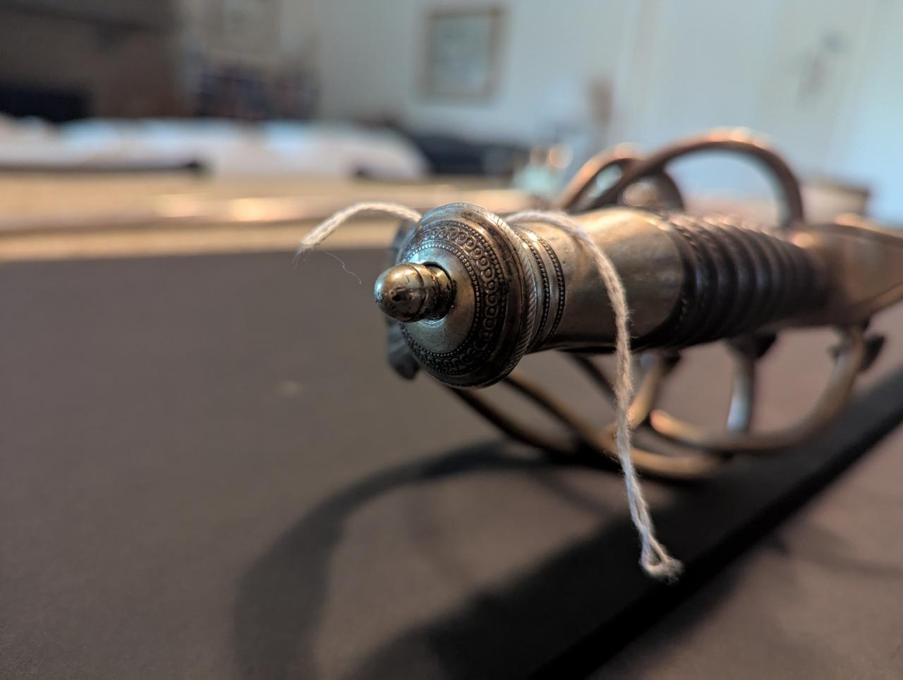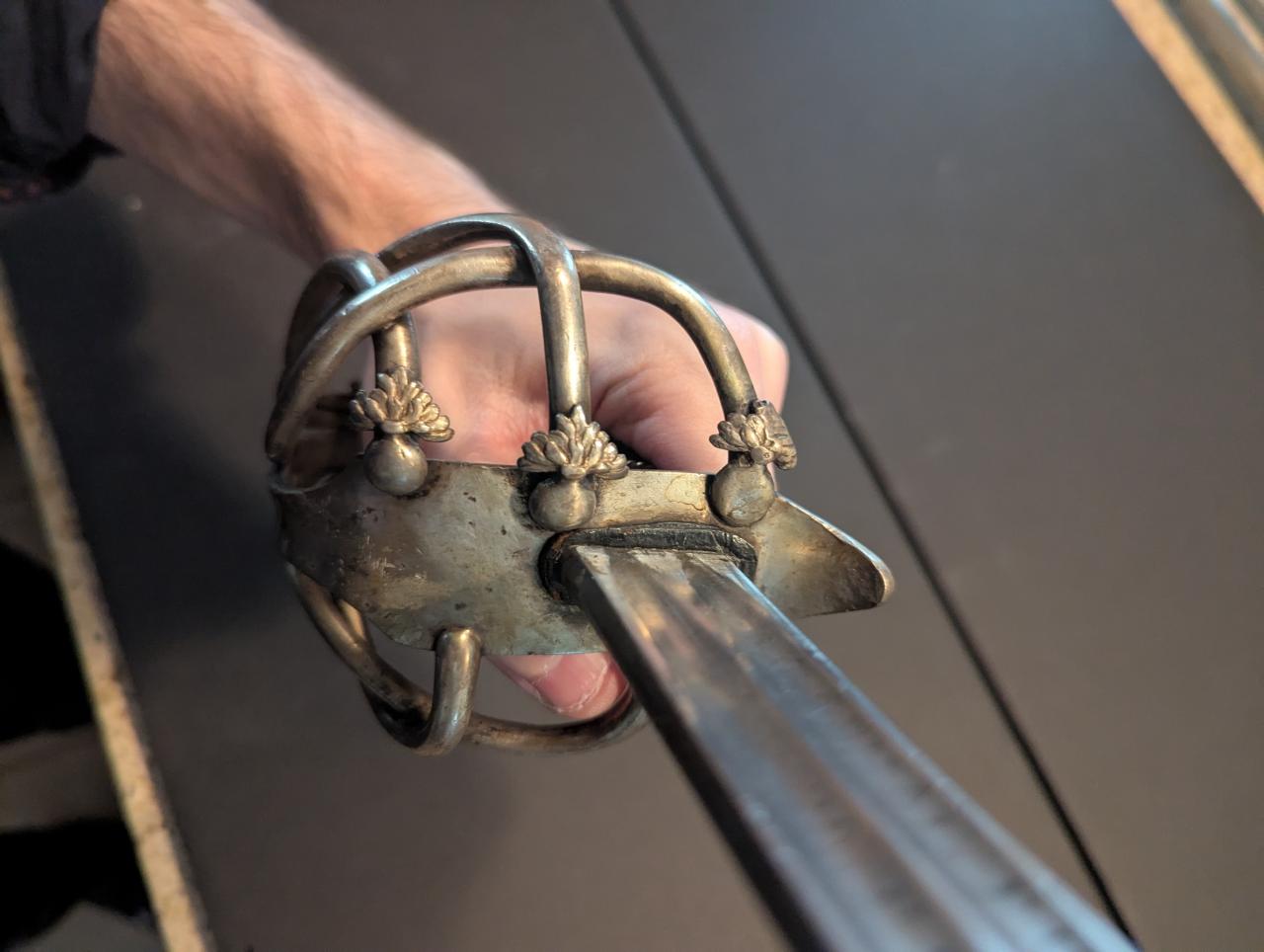 As above, it has arrived. I would congratulate Bonhams on using a deceptively fine camera lens. Photos appear as if the guard is quite large. That is not the case whatsoever. The guard is extremely form fitting, like a British Scots field officer's sword (a bit of foreshadowing). It is of a non ferrous metal, so their description of a 'silver' hilt may actually be true. The nut at the top, almost like an old top as in the toy, is threaded. I was able to unscrew it with absolute ease. The bow of the guard is secured a la most sabres to the pommel cap underneath. Whatever metal the guard is made out of has mild flex but I'm not going to do anything severe enough to attempt to fully disassemble it. However, I would guess that the knucklebow, like a Wilkinson, is already secured to the blade, perhaps by a 2nd hidden nut? The pommel cap is set somewhat asymmetrically to fit on the grip and tang. What this means I cannot say but when looking perpendicularly down at the pommel, the center is off by a few mm. Perhaps a way of taking a curved tang off center and doing what you can? The stats are as follows, from a rough bed estimate: -Weight == ~775grams, give or take some due to the extreme length and balance -Blade length == ~85cm, but with a rounded tip that looks quite weathered it may easily have been 86cm back in the day -Width/thickness == 30mm wide which seems to be exactly where I would assume, but only about 7-8mm thick. I suppose this is consistent with earlier blades, however it may have been a bit wider as heavy grinding marks are observed on the ricasso and the spine. -Both the spine and the ricasso are angled to form narrow slightly undulating ridges. As this is outside of my general area and god knows I cant afford early 18 or before at this point, I will photograph it later and leave discussion to you all. I was unable to find any markings whatsoever. Over the ~300 years since the blade was made, it appears to have gone from a flattened hexagonal-to-lenticular profile into a more lentincular one. The engraving is the same on both sides, and you can faintly see those period-appropriate decorations below the fullers. I cannot fully make out the engravings myself but I trust what has already been posted, perhaps combining both sides will make it easier? As I said above, the hilt is much smaller than photos made it out to be. Fortunately, what I perceived as a round bulbous thing meant only to be hammer gripped is actually quite pleasant in the hand. No curve, but closer to the french 1845/55. Feels quite nice and one can index their thumb on the back nicely. I cannot execute a fully extended Radaelli type grip, but it feels better than most 'spadroon' grips that the north and western Europeans used at this time. How it feels in the hand? I had initially thought that this was a broadsword, quite literally, based on the images. However, when moving the sword around, it feels closer to what I would consider a shearing sword or thrust-centric backsword. The foible has flex, but is still quite sharp. POB is not far enough down the blade nor is it wide enough to be a hugely effective cutter, although wrist-articulated actions would at least do serious damage to any unarmoured limbs. The spine stays thick or at least flat-ter than the front only to the edge of the double fullered engraved forte, upon which it becomes as sharp as the front. Maybe not a truly symmetric double edged sword, but let's call it 87.5% of the way there? If you've ever handled a Scots Field officer's sword before, or even the French superior officer's sword, this feels extremely similar. Quite similar to a Spanish-influenced Neapolitan sword I have and wrote about on the SBG forum and is my favorite non-sabre sword of this era even. Like that, there is a certain liveliness to it. Similar to a spadroon but my primary issue with at least the British/German/Swedish styles is those grips are so narrow, with vestigial finger rings, that even if you wanted to cut it is all but impossible to hold them nicely. That is not the case here. It is not optimized for thrusting in that there is anywhere to pinch or finger the guard, but it is a much more neutrally designed grip you can hammer or handshake with equal success. Whatever the Grenades are made of is the same material as the bars of the guard. The grip was once lacquered as evidenced by remains of black intermittently. Silver wire twist in the grooves. Blade is a bit bent and I may attempt to alleviate that later. A more post-Napoleonic black leather washer a la the French sits at the ricasso. Very thin and a bit rubbery, I have not yet attempted to remove it to see what is underneath but it is <1mm so there are no markings. The shape of the main guard does remind me of this sword here: https://sallyantiques.co.uk/product/...-hilted-sword/ (Please let me know if this should be removed, it has already sold, I am only posting it for reference), with a similar curve of the tail, the boat shaped main section, and the way the bars of the guard extend from it. Any possible provenance that is mine to guess would probably be a senior officer either mounted or dismounted, but leading a non-mounted unit given it is not as robust as most cavalry sabres are, but that is based solely on my experience with British and French superior officer sabres, which are quite lovely things. Ironic to lock away a very well balanced svelte thrust-and-cut sword behind a rank at which you are unlikely to ever use it. All of that to say I still have no damned idea what it is. I've gone through all 77 pages of prior threads to open everything I find interesting and am still working my way through those. I am fully open to the idea of it being French or anything else. However, I was under the impression that this specific type of grip and pommel cap was for the Spanish, Mexican, colonial, post Colonial, etc. sphere of Latin America, and I would be curious to see other designs. I buy swords as mechanica