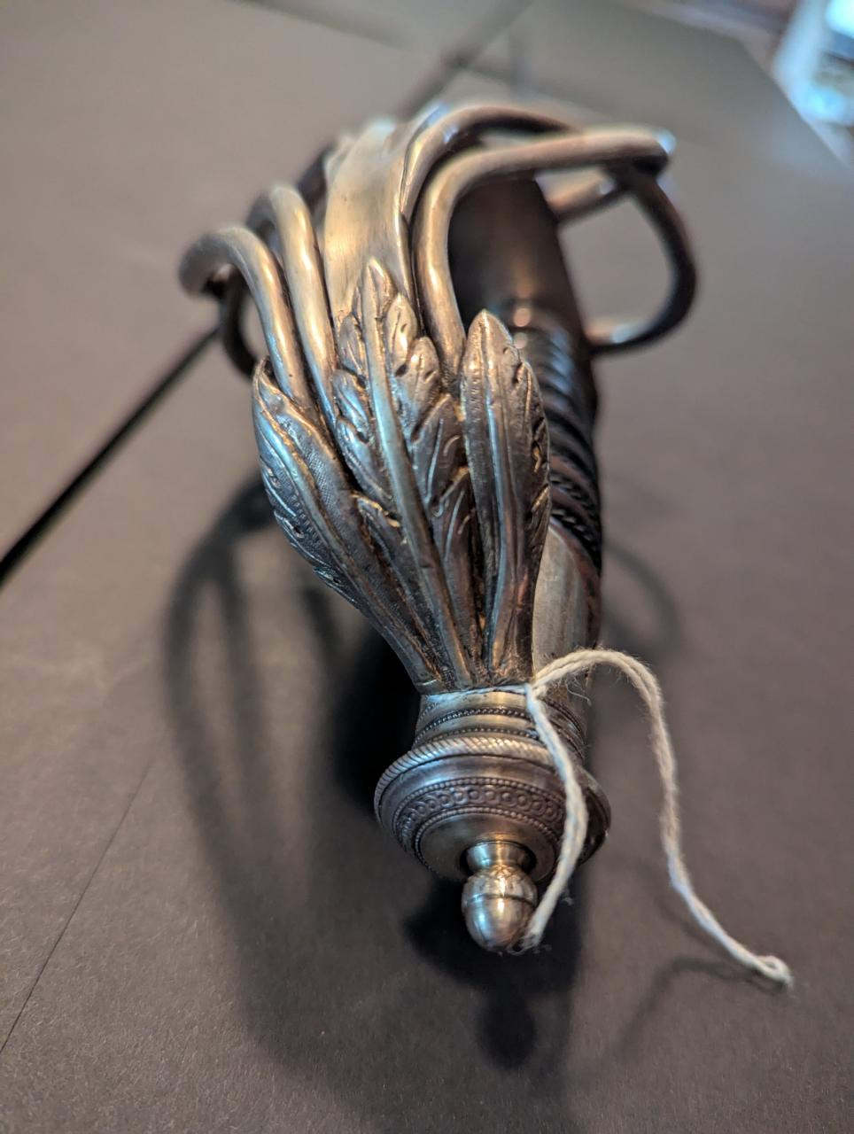 Apologies for the late update, life keeps getting in the way of things. I could not find the rifle rests I usually use for photography so these are mostly top down. I will not speculate on too much, as almost all of it would be unsubstantiated but I am curious if the hilt is not actual silver but the German Silver/Nickel Silver used by the French. I have taken some comparison photo with this sword next to a standard 1882 and also a non regulation 1855 model of Superior Officer's Sabre with the earlier blade fullers.