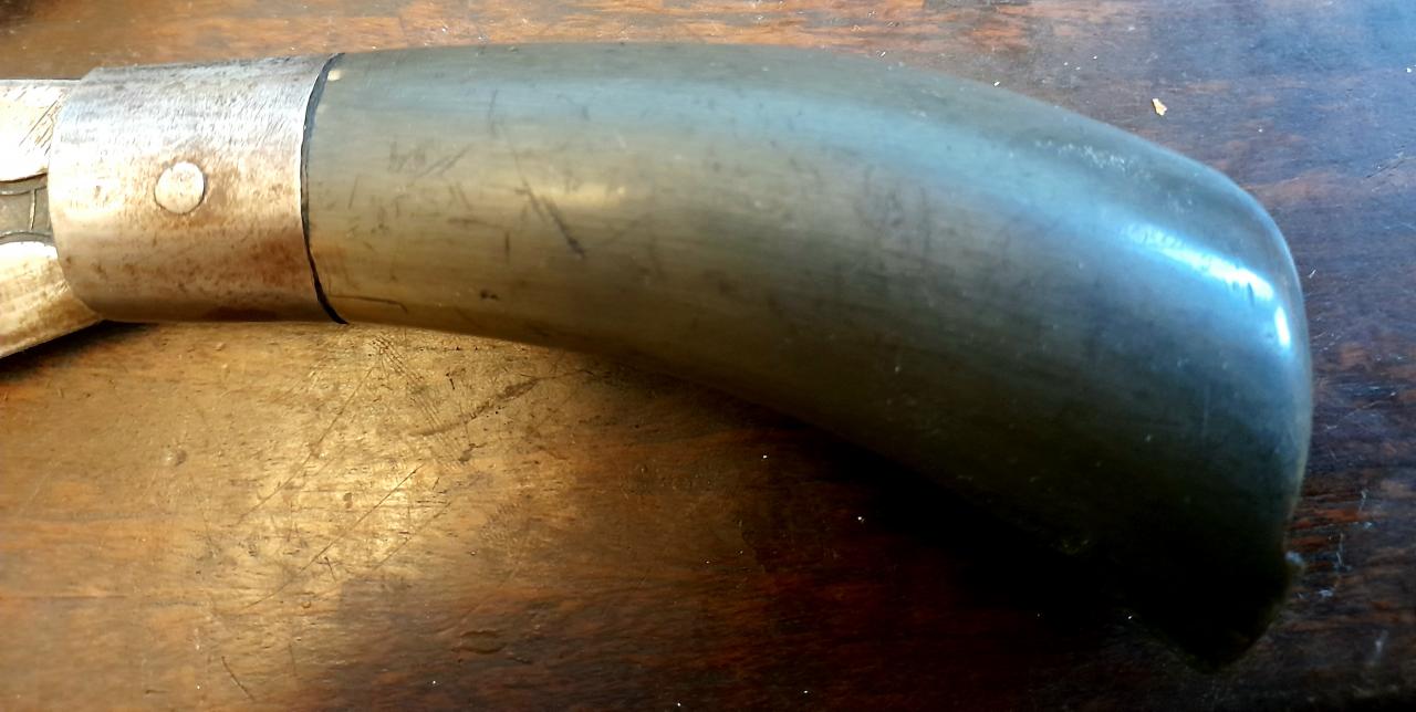 Any thoughts on the type, age and origin of this Indonesian type chopper please? Markings are strange including the pointing hand stamp. The script seems to be Chinese and Japanese using Google so I'm stumped. Steel ferrule. Lovely green horn hilt Solid very sharp blade with clipped false edge. Thanks
