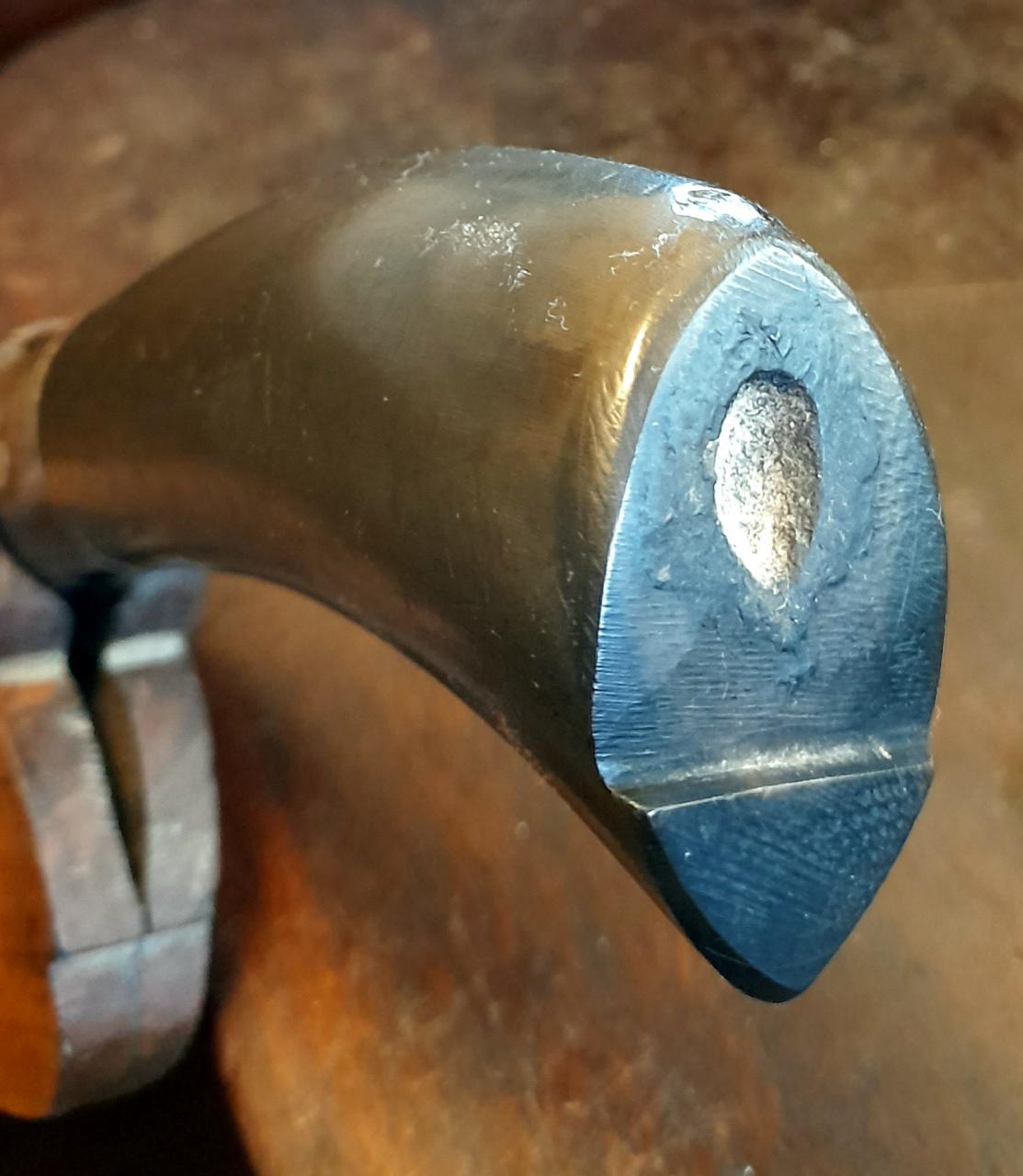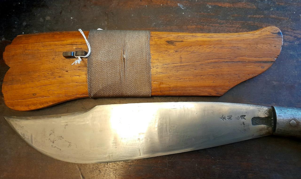 that blade is way smooth and nicely ground and struck to nicely to be a cheap Chinese imported item. i see the rivet in the bolster. its odd. you see thai items from the 60s onward with these pins in the bolster to hold the blade in, but its not a historical thing.... .. its just people forgot how to attach the handles precisely by burning and resin and began putting ins and glue.. you can see the pins in the bolsters appear in java in indonesia in the 80s too for the same reason- decline in skill in fitting the handles... but this knife looks older than that. the die is a factory made and crisp, a hot stamp die- there is also a logo. the blade is a weird shape.. and not of any known style i recognise., the handle is like Meo and cambodian and some thai knives. i have seen pre war japanese knives/machetes made to export to guam/carolineislands.. kiribas.. and also some to the philippines and thailand with japanese characters on them but these were all replicas of local knife types that the japanese traders (naval intel officers) opperating as merchants were offering to the locals along with other japanese wears made for the local market.. these traders were widespread in asia till the end of ww2 and gathered a great deal of intel and info about local ethnic groups in regions they operated in and offered japanese goods tailored to the local market, those japanese factory made "bolos" do have japanese text on the blades. this knife has an exotic look , the fact the bolster is pinned makes me think japan too. malays goofing up and pinning bolsters? no at least not until very very recently. can we have more pictures.. the butt of the knife the scabbard the knife in the scabbard, thickness of the blade and so on. im guessing japanese made.. for the thai market pre ww2. |