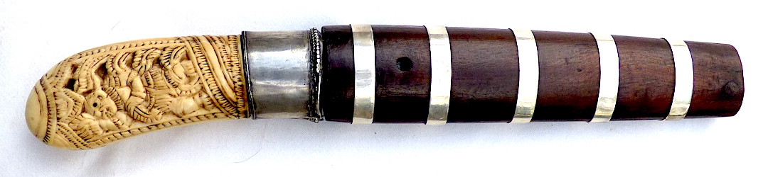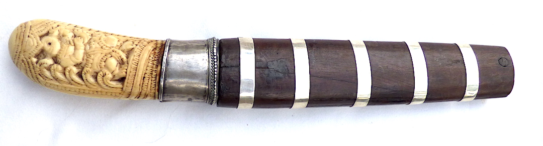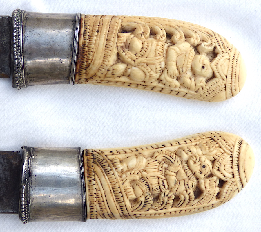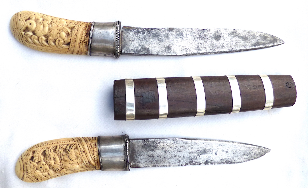 This is a rare item. I've been collecting mainland SE Asian swords and knives for nearly 40 years and have never come across, or seen pictures of, a pair of Burmese knives in the same sheath before. I'm calling them "twins" but the blades are of different length and appear to have been made that way originally, judging from the way the spines of each blade differ slightly. I believe the fittings are silver but I have not tested them. Judging from the areas of discoloration, the carved hilts may well be bone.