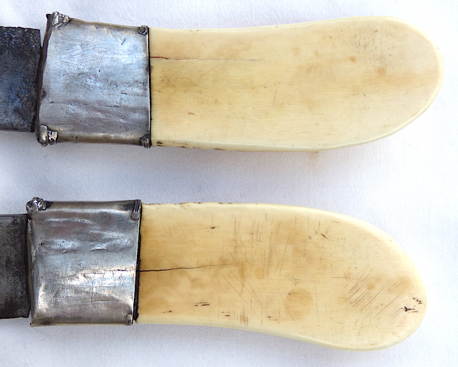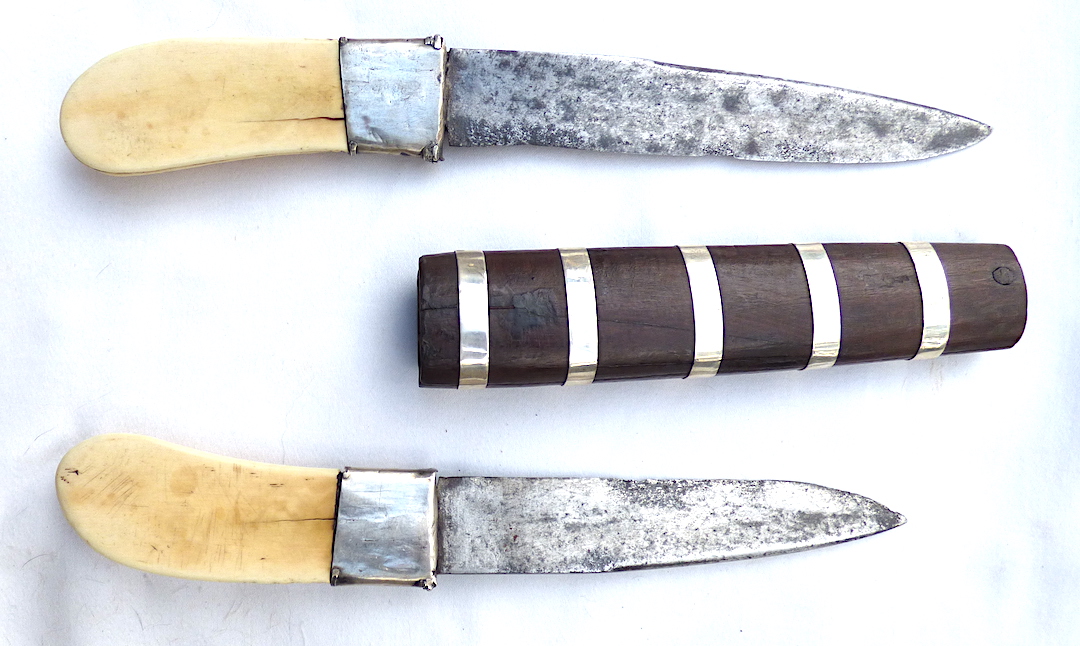 The blades are of far better than usual quality. They are razor sharp and each has a small chip on the cutting edge. They have certainly been used. Judging from their condition, I believe these knives are probably mid- to late-19th C. OAL in sheath = 9.25 in. Knife 1: OAL = 9.0 in., Blade = 5.5 in., Hilt = 3.5 in. Knife 2: OAL = 8.125 in., Blade = 4.625 in., Hilt = 3.5 in. Price: US$425.00 plus shipping and insurance To save you money, I ship with Australia Post which is less than half the cost of private shipping companies. Please request a shipping price. The item should weigh about 500–700 gm when packed. Shipping to the U.S.A. is a crap shoot at the moment considering the highly confused tariff situation created by President Trump. In the past, this item would have fallen below the de minimus level for import duty. Now it likely will attract import costs levied by U.S. Customs. I am very reluctant to ship any edged items to the U.S. at the present time. Please note, I do not ship to China or Russia. . |
