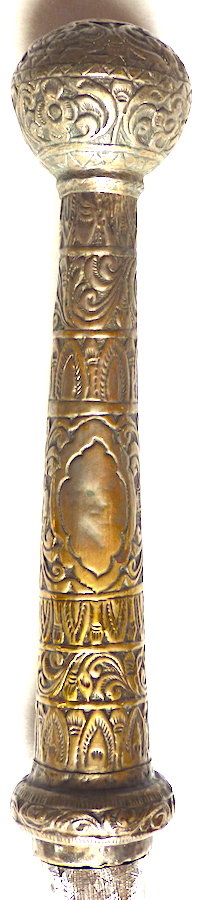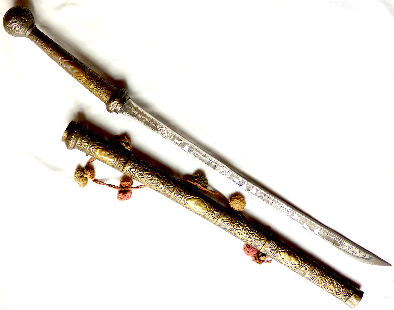 The hilt and scabbard are covered in chased brass over wooden cores. The decorations are typical Burmese vegetal designs with small blank plaque areas. The pommel is globular, probably brass over a wooden or resin core. OAL in scabbard = 46.5 in. Blade = 31.5 in. Hilt = 13.5 in. OAL ex scabbard = 45 in. Asking US$475.00 plus shipping and insurance. This is a heavy item, weighing about 2 kg when packed. I use AUSPOST to save on shipping costs (AUSPOST is half the rates charged by private shipping companies). Please check shipping costs with me. Given the current uncertain trade tariffs, I am very reluctant to ship any item to the U.S.A. Please note that I do not ship to China or Russia. |