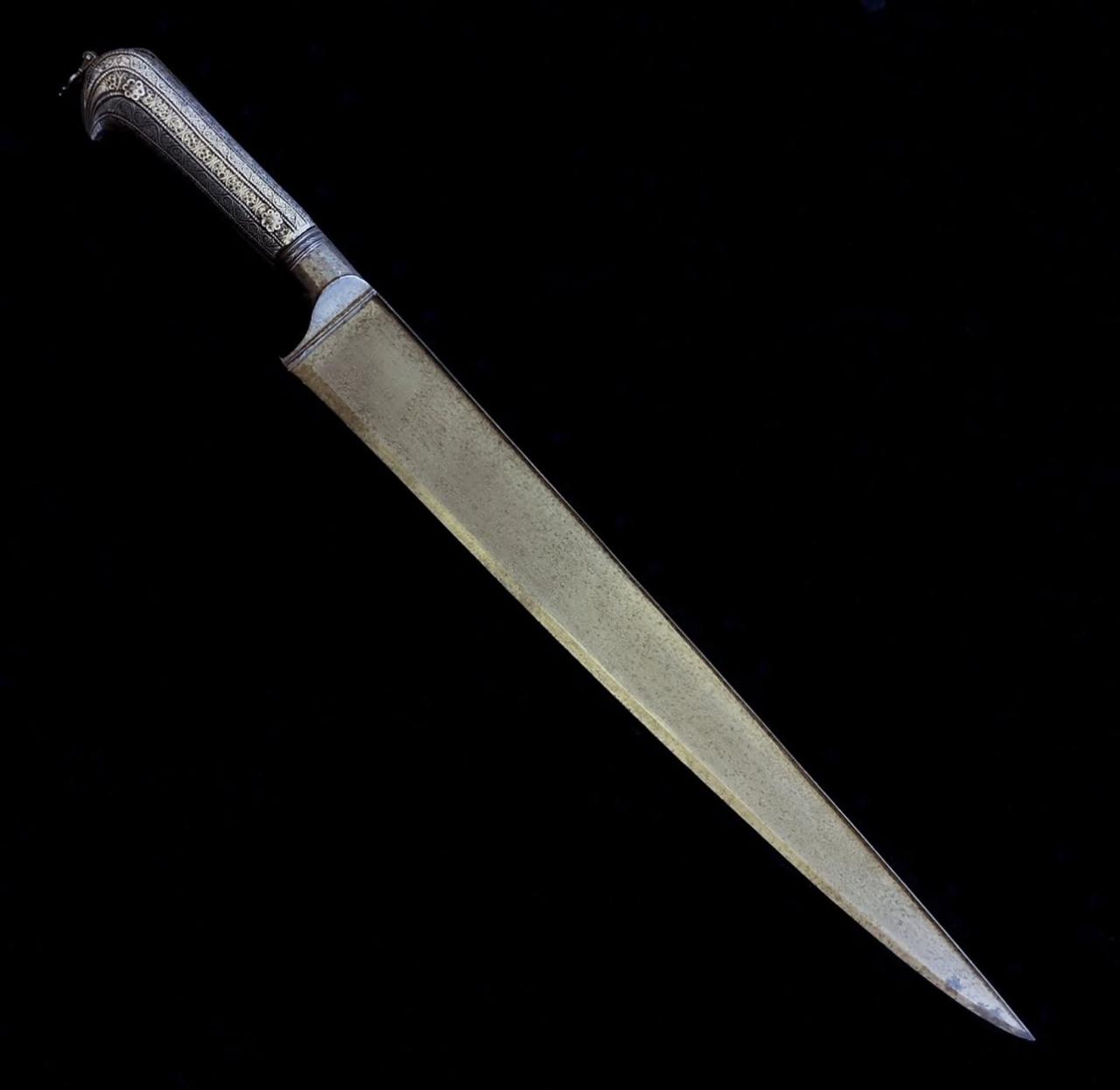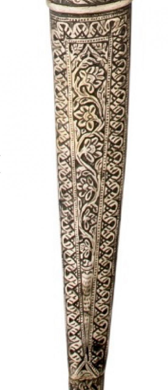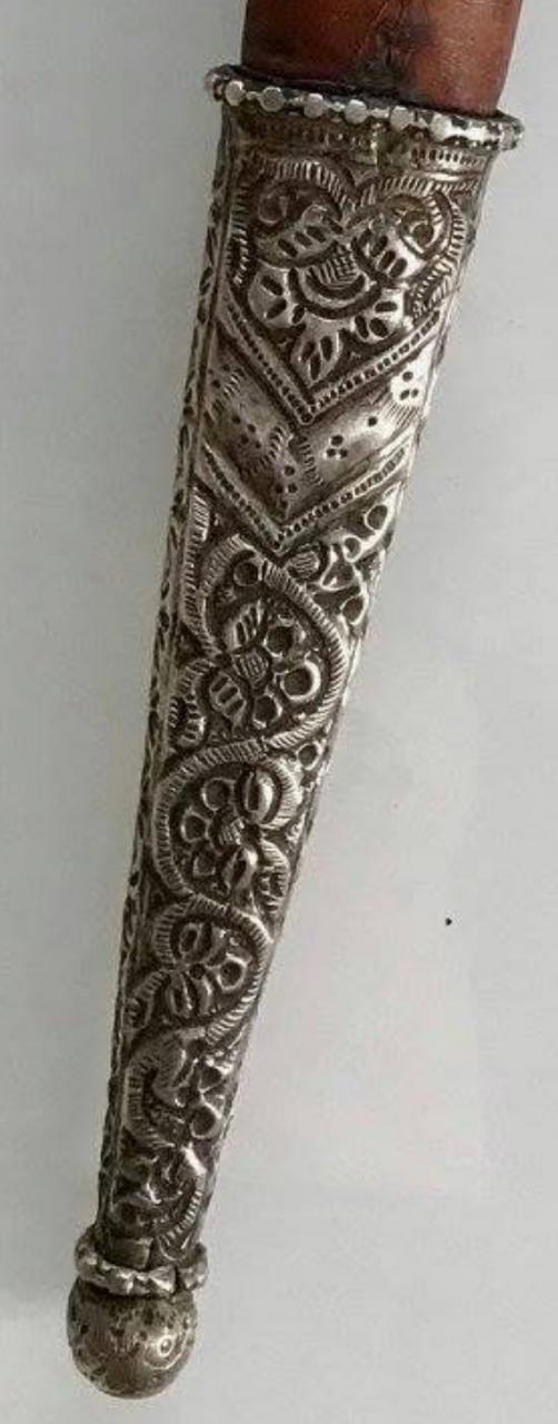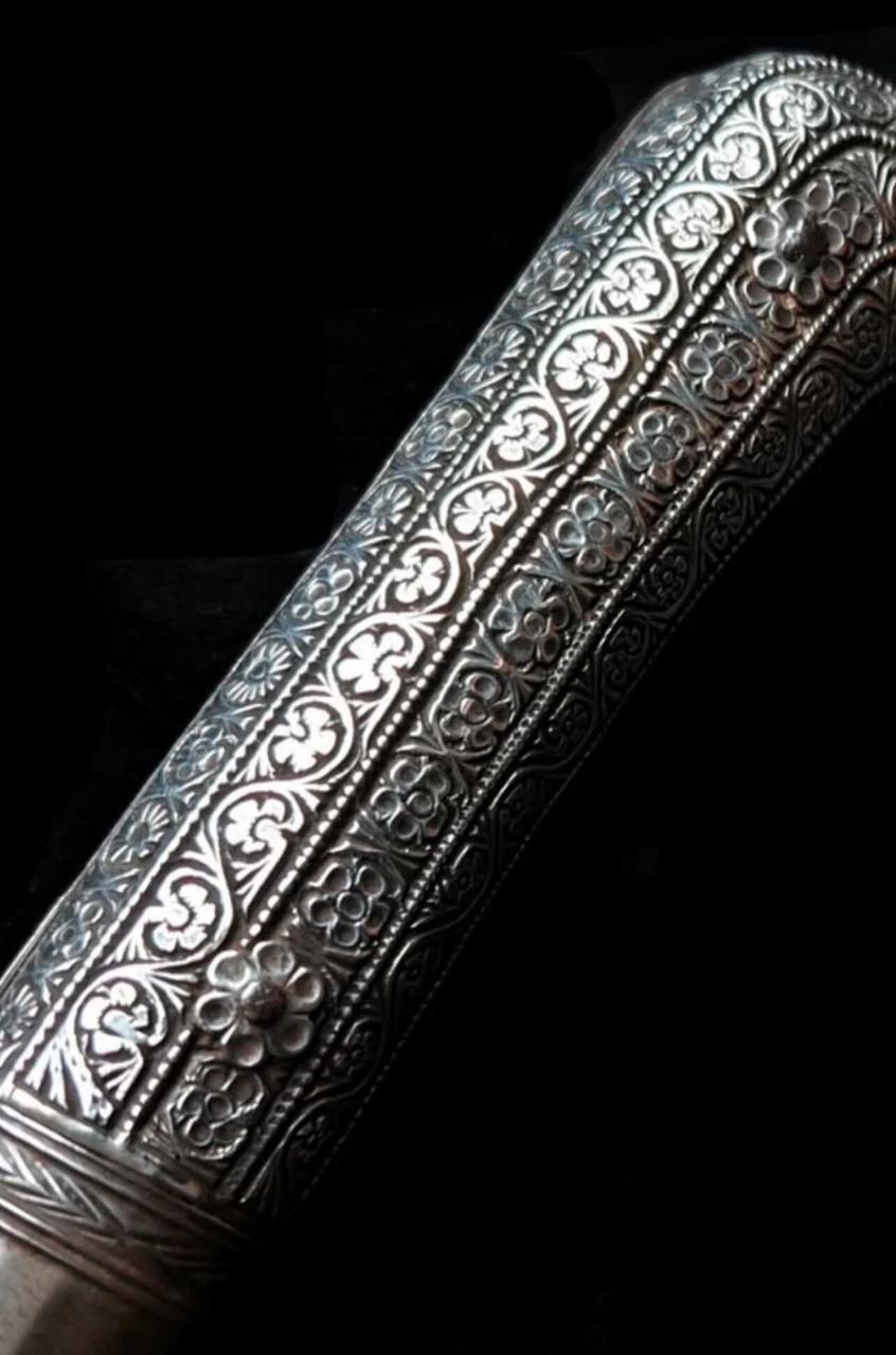 This khyber knife which has a handle wrapped in chased silver was labeled as Indian, but faceted bolsters are commonly found on Afghan khyber knives, and the chased motif resembles motifs found on Afghan silver chapes. That why I believe it’s Afghan but I’d like some input