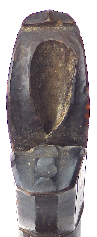I'm interested to hear what our Indonesian experts think of this one and where it may be from. The blade has a shape reminiscent of a Moro kampilan, but much shorter. The back half of the blade adjacent to the spine on each side has repeating rows of semicircles containing "o" marks that look a little like eyes--perhaps "eyebrows and eyes" might be an adequate description for the basic motif. The bottom part of the blade on each side is smooth and has a dark patina. The width of the spine at the guard is approximately 5 mm, tapering to 2 mm before turning down to meet the tip.