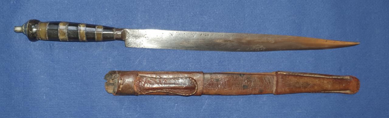 "Finnish puukko with birch bark/brass handle and leather sheath. Overall length: approx. 34.5 cm. Materials: Carbon steel; handle made of stacked birch bark discs with brass spacers and brass end cap (tang riveted/peened at the top); sewn leather sheath with belt loop. Identification, origin, dating: The design, handle construction (stacked birch bark with brass rings), and end cap with continuous tang are typical of Finnish puukkos (Kauhava/Lapland tradition). The technique and function of the birch bark handle are described precisely as such in specialist and dealer literature. The narrow, single-edged blade type with a short shoulder and no guard, along with the simple leather scabbard with a high-set belt loop, correspond to common 20th-century puukkos. Dating: based on workmanship, materials, and patina, circa 1930-1960 (mid-20th century), thus classic post-war/pre-war production. (Classification based on comparison to typical period mass-produced puukkos with a uniform age patina and localized rust/pitting; edge functional, refinishing possible. Handle firm; slight drying cracks between bark slices. Scabbard complete, heavily worn (seam and edge abrasion, seams partially open); overall authentic used condition.)"