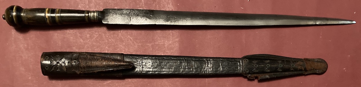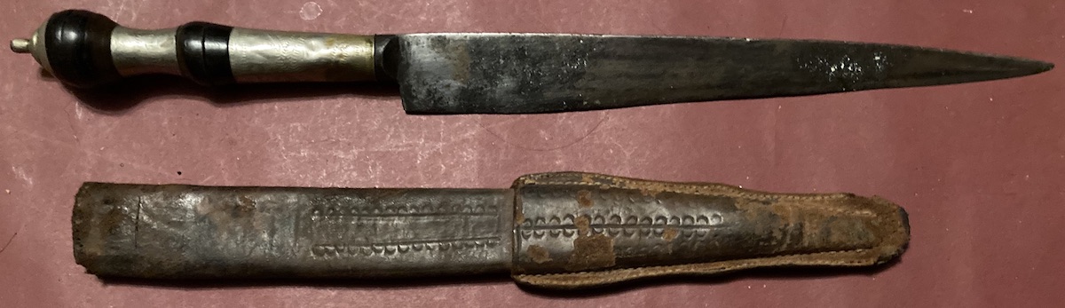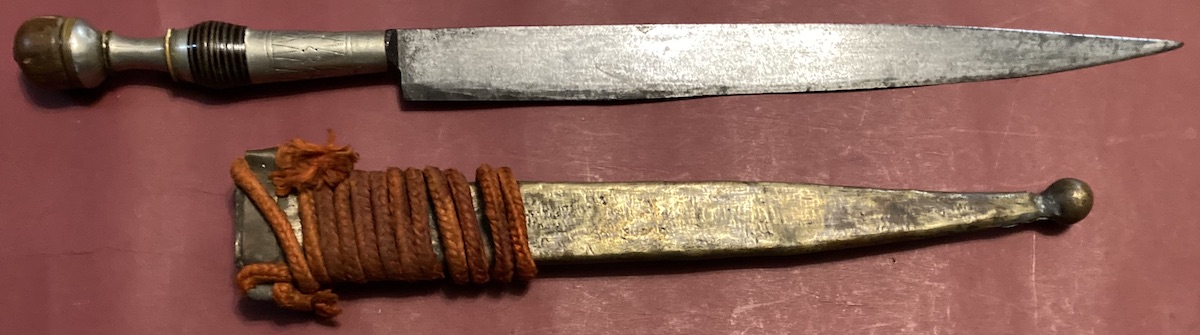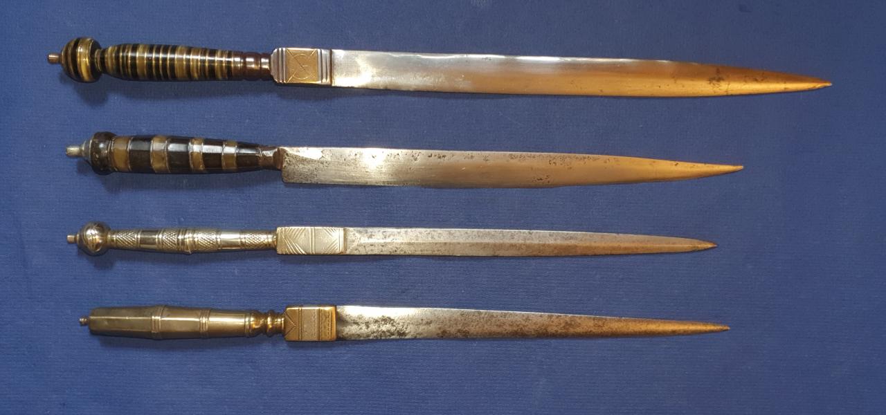 Here are six more examples. The first one shown has a whopping 12.5” (31.75cm) blade and is double edged with a scarf weld close to the hilt. The rest of the examples are of typical length. I am not sure if the brass sheath for number four is original to the dagger but it fits well. Number 5 has a bit of an odd looking blade. We will most likely never know why some FDP have a ricasso cover and some don’t but I wonder if if isn’t due to different areas of manufacture.