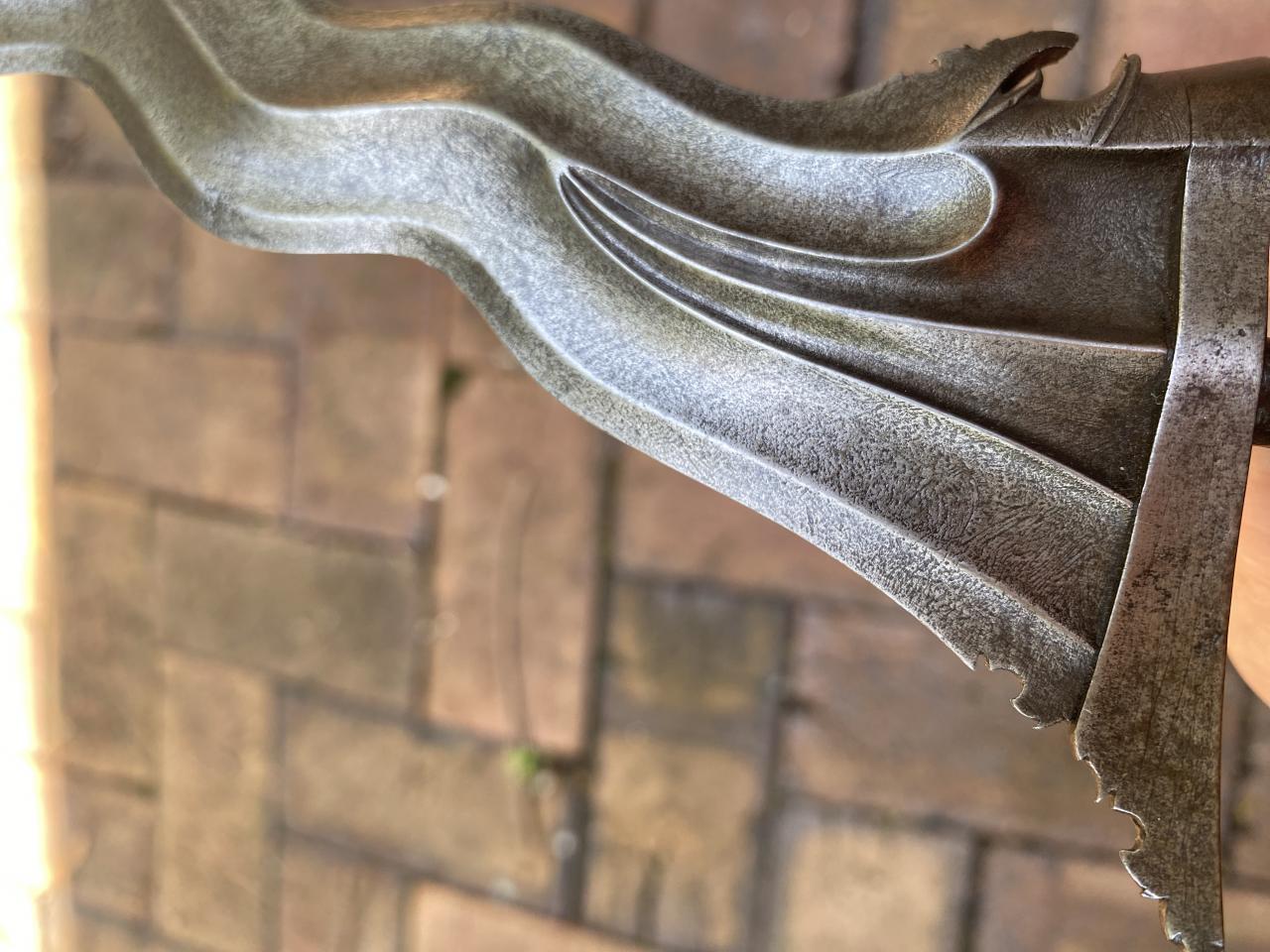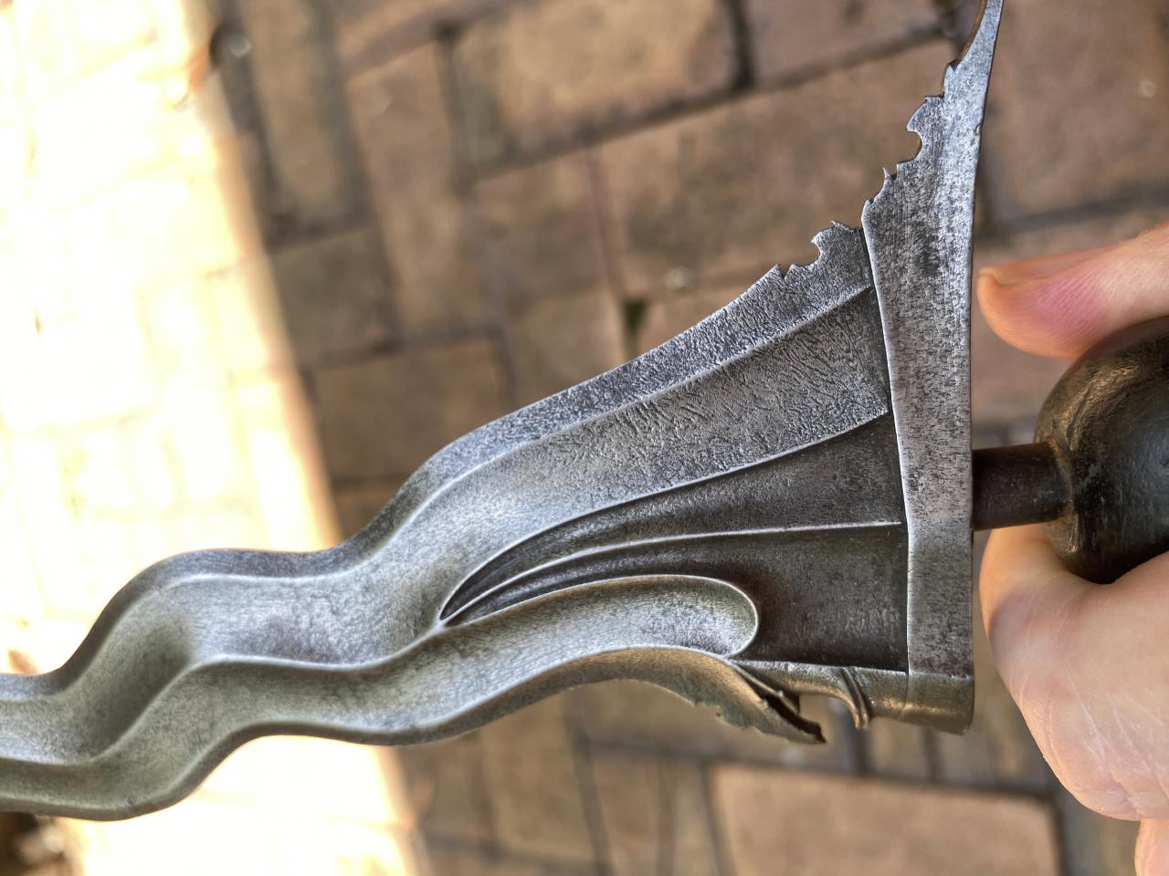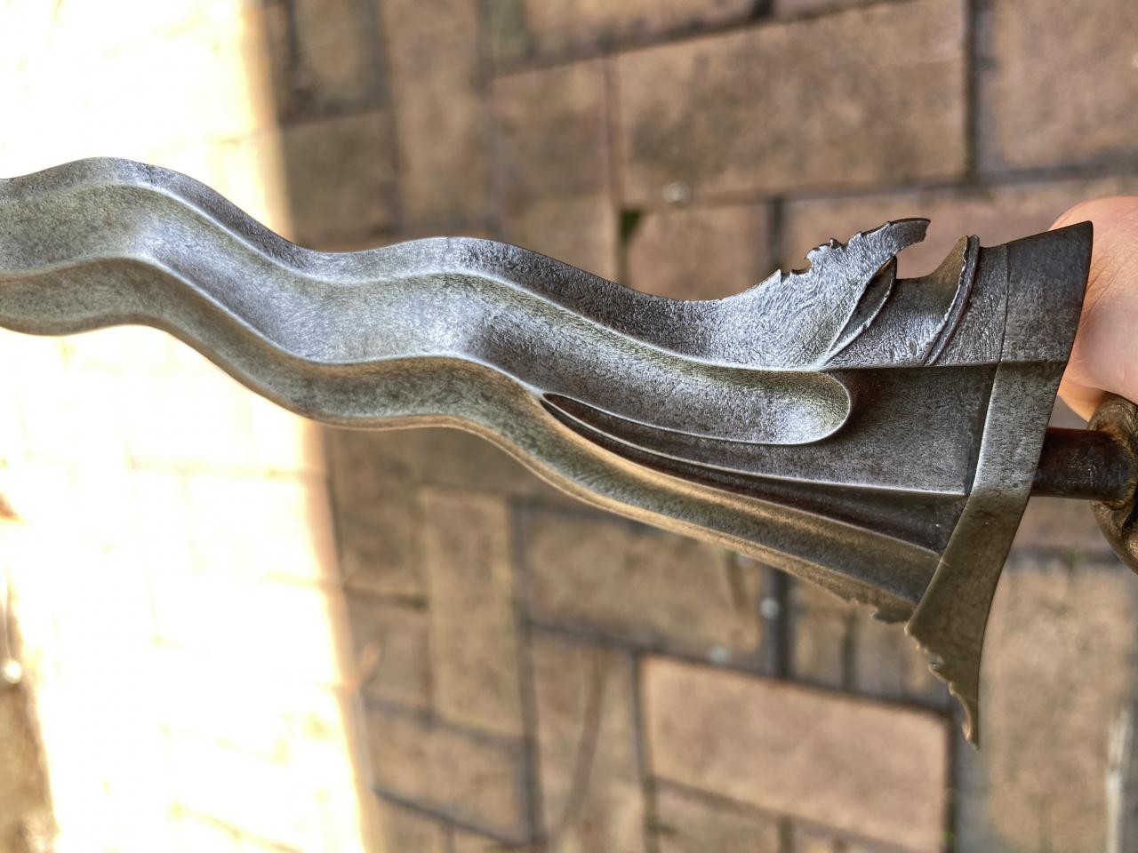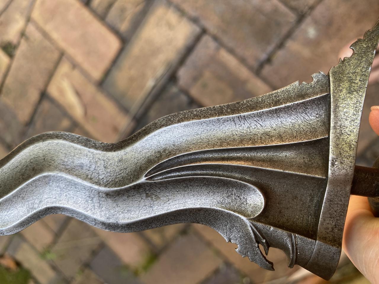 Is anyone willing to venture an opinion on the swirly pattern evident in this Malela keris? Is this crucible steel, unlikely as the prospect of a wootz keris blade might seem?