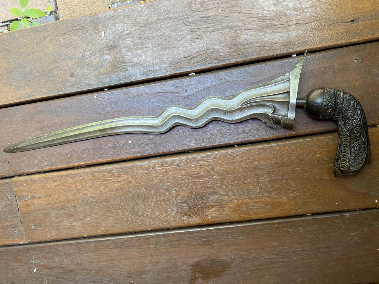 Is anyone willing to venture an opinion on the swirly pattern evident in this Malela keris? Is this crucible steel, unlikely as the prospect of a wootz keris blade might seem?