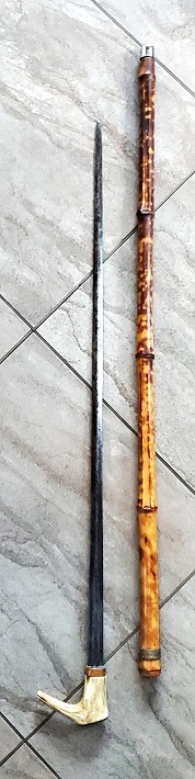 It seems these became popular among officers during the British Raj in India, though it is unclear exactly what influences may have diffused the idea into that context, or from which ethnic or regional factors might have done so. It seems fairly well known that concealed dagger blades were present in various Indian weapons such as war hammers, battle axes etc. and these features were also known in Persian arms so presence throughout Central Asia and the Middle East as well as the Orient seem likely. Whatever the case, the popularity in Europe seems to have been largely from influences in India. These are most intriguing weapons, but difficult to acquire or transport due to legal issues as concealed weapons. This example is British, with Solingen rapier blade (Toledo's were highly favored due to British fascination with fencing from mid 19th c) and termed a Malacca (for the source of the bamboo used for sheath). |