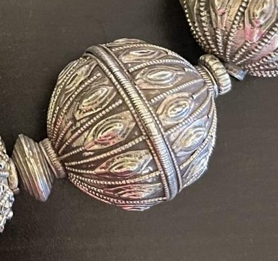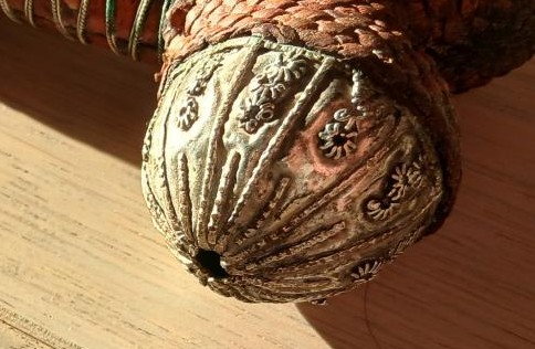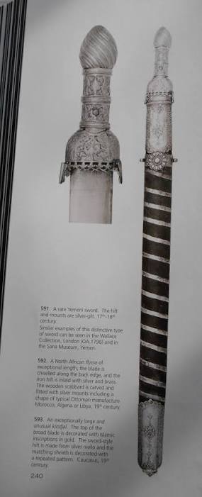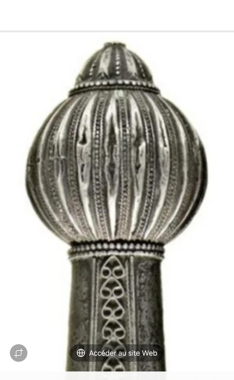 One with a look-like finial sphere pommel, The others who shows a silver strip decoration all around the scabbard typical of Yemen or Oman work. The last ́’providencé’ picture coming from a 2008 thread about yemeni swords showing a sword with crossed wires decorations on the scabbard. I wonder in wich bad wet conditions ́’miné’ was kept for turn the silver wires all ́’flash’́ green; low grade silver with a lot of copper ? |
