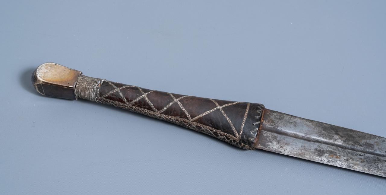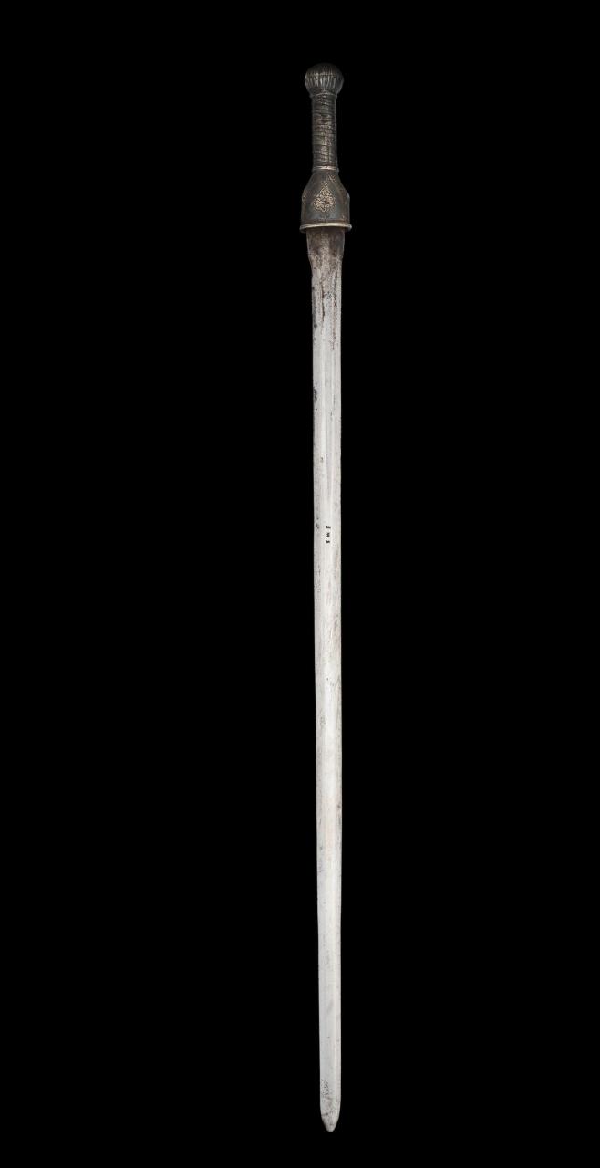 Now that I can better see the silver decorations, I think it can come from South Arabia / Yemen.or Soudan A staff for patriarch hadj man.... sword size, 83cm without scabbard Symbol for the two half sphere ? Maybe something missing în the small holes |