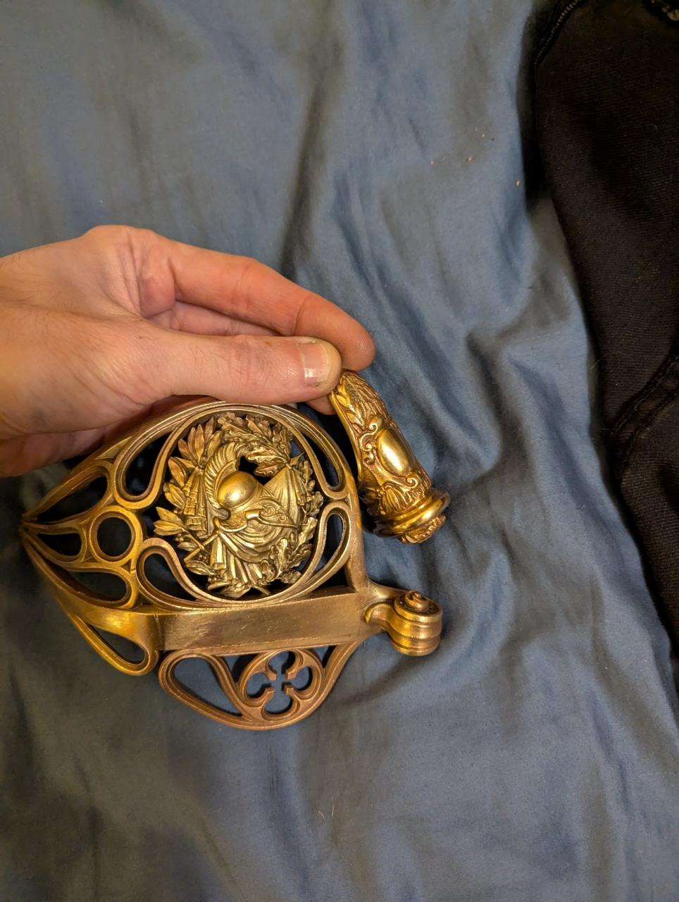 I do not like to reply without images so the attached is a true mystery to me when it arrives. Saw it at auction, the hilt and blade interested me, but I did not bid. Saw it again some months later and I am quite superstitious in a 'small bits of fate' sort of way so I knew I needed to get it. Whether it is a composite or not almost does not even matter to the central mystery: the guard is of the bataille hilt style from the Ancien Regime through Napoleon, as is the shape of the blade (95cm by my estimates). However, the grip is horn, and the plate on the guard is of the type associated with superior officers, specifically the 6 flags. Image #2 is a half finished superior officer guard of a rare "Gothic" type I got and will one day have finished to be mounted on a NOS superior officer blade (not trying to pass off as truly original, but I've long wanted to take old unused parts and make "new" swords just for myself) for comparison RE the flags. The blade also appears to be one of the rare French types that is etched in a Franco/German style, and not blue & gilt. My current theory is mid century when they had that other fun period of changing governments like women change purses. The ship in the middle there is usually related to Paris.